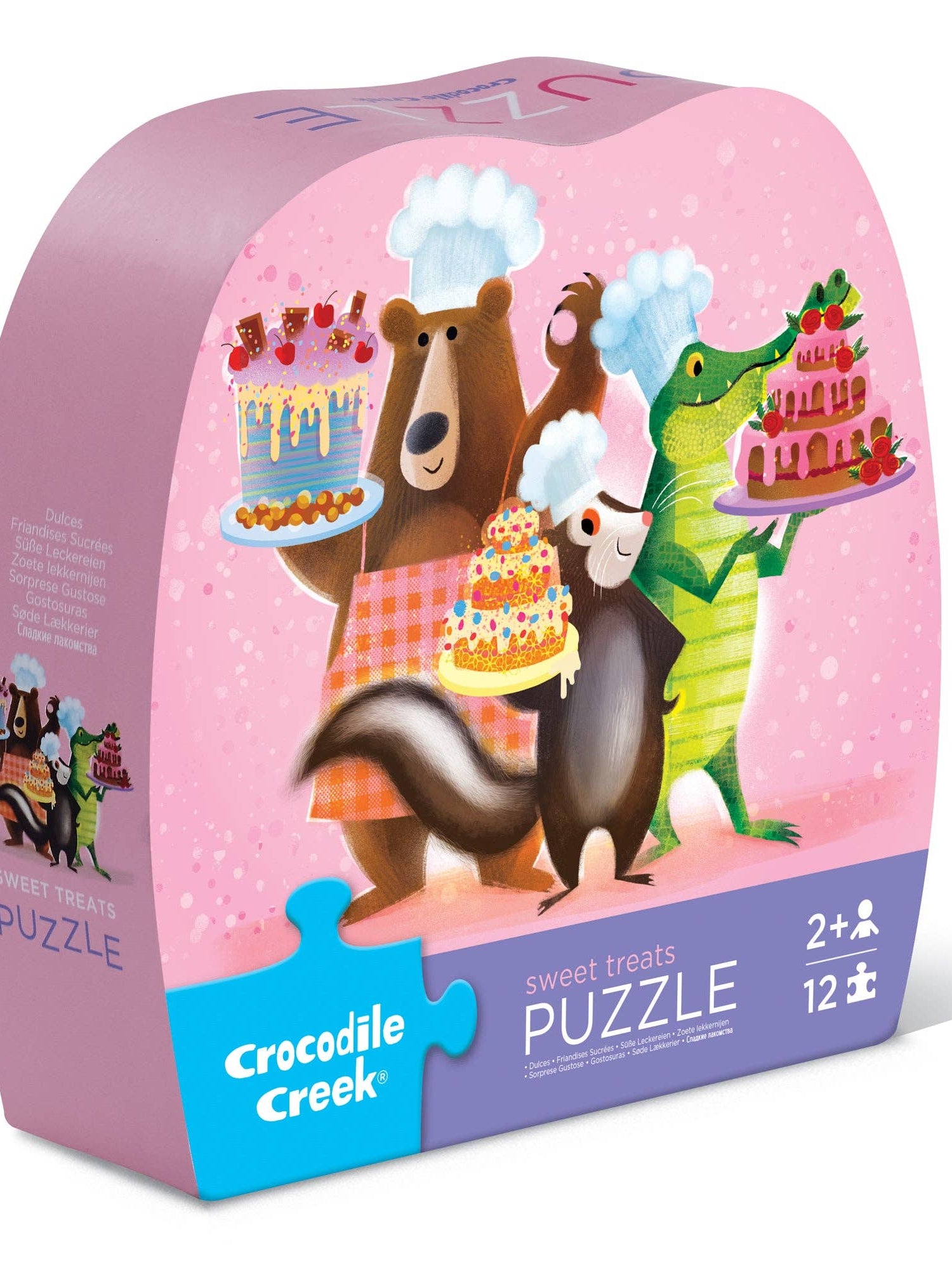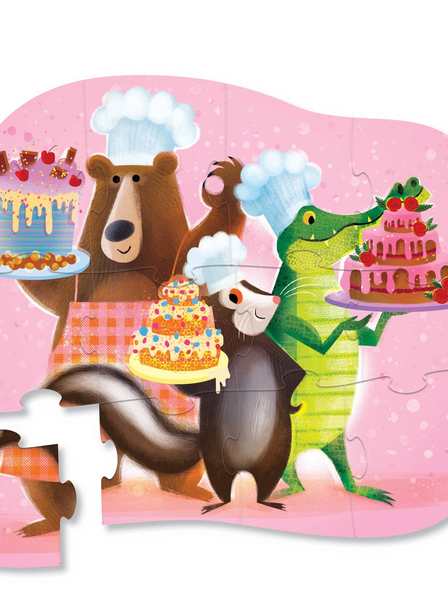 Bake up some fun! Our Sweet Treats puzzle will delight any little one who loves helping in the kitchen. Featuring a cheerful bear, crocodile, and skunk busy baking together, this whimsically illustrated puzzle encourages hand-eye coordination and problem-solving. Great for interaction between a parent and child that can be used over and over. A sturdy box makes for easy storage and its small size is perfect for travel.