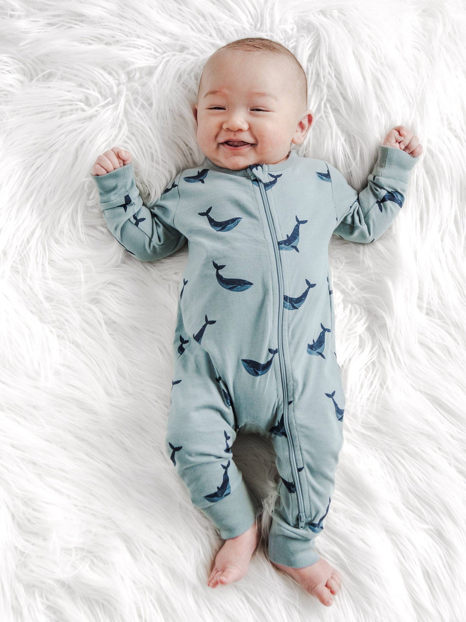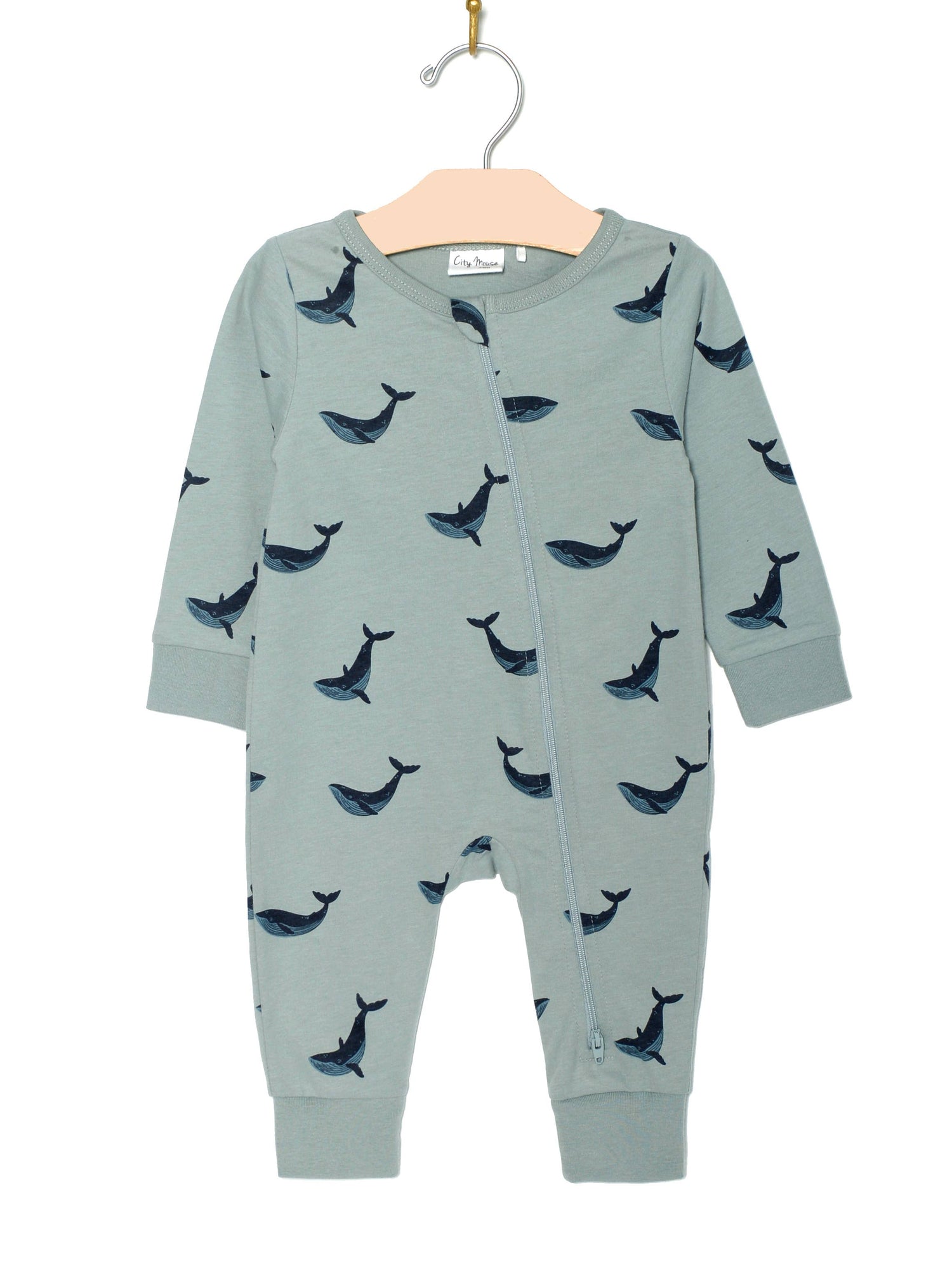 City Mouse Zip Romper - Blue Whales - 0-3m is backordered and will ship as soon as it is back in stock.