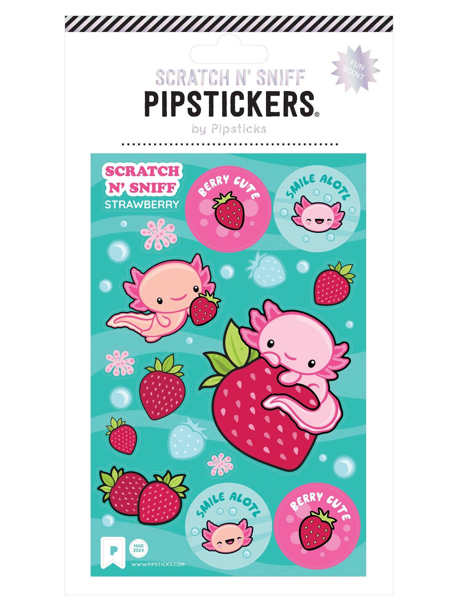 Includes one 4" x 6" sheet of Berry Cute Axolotl Scratch 'n Sniff strawberry scented PipStickers.