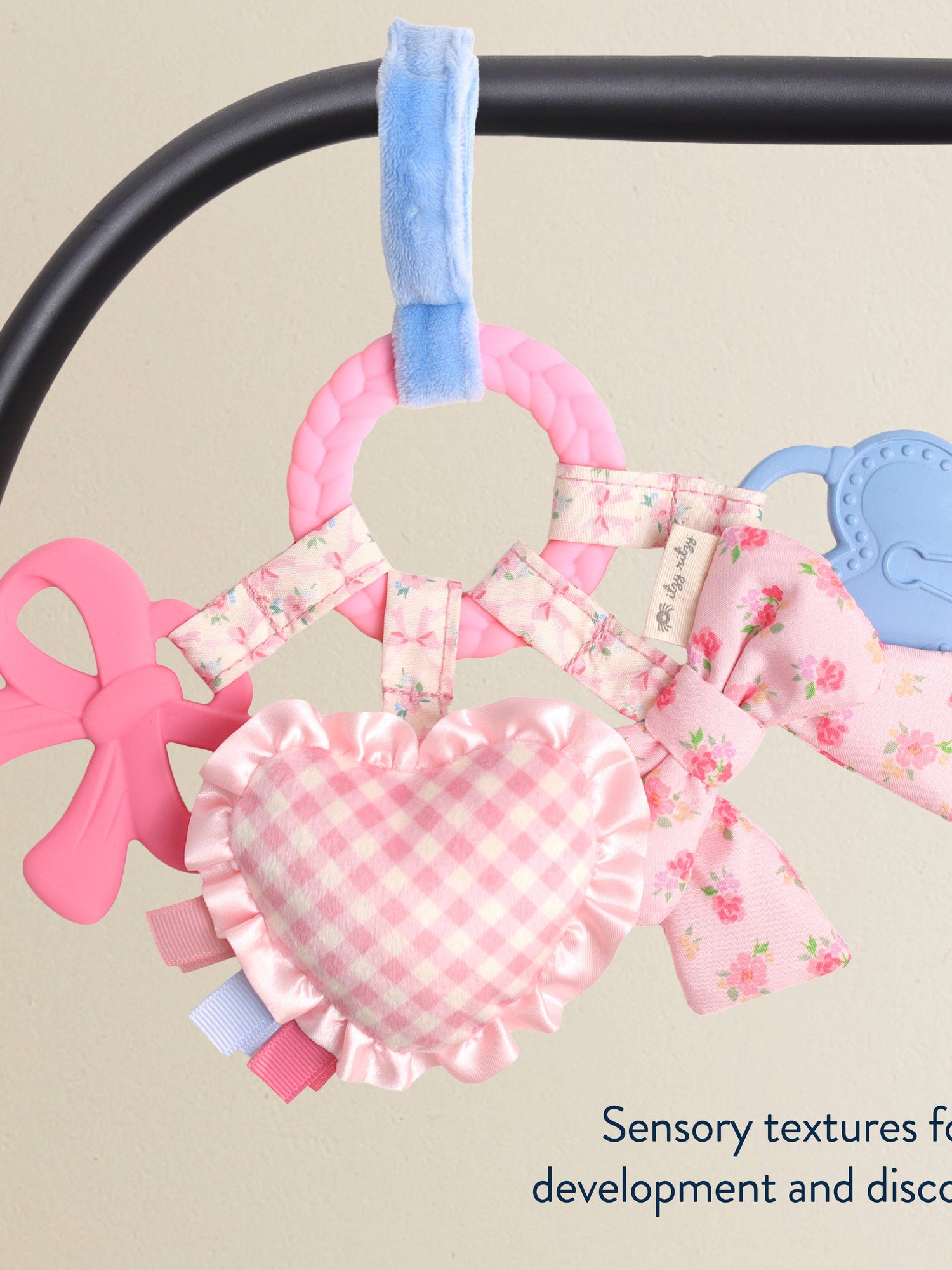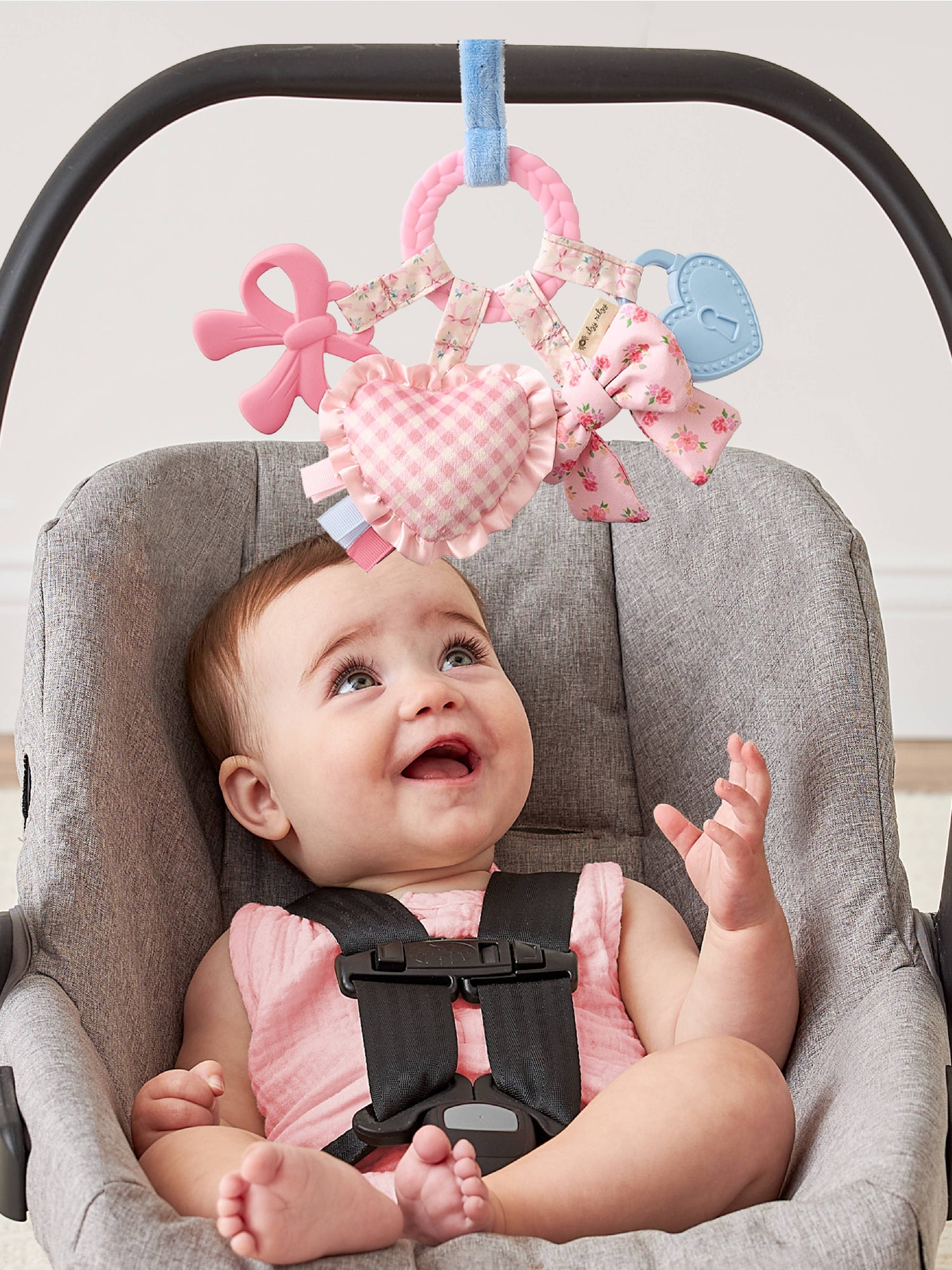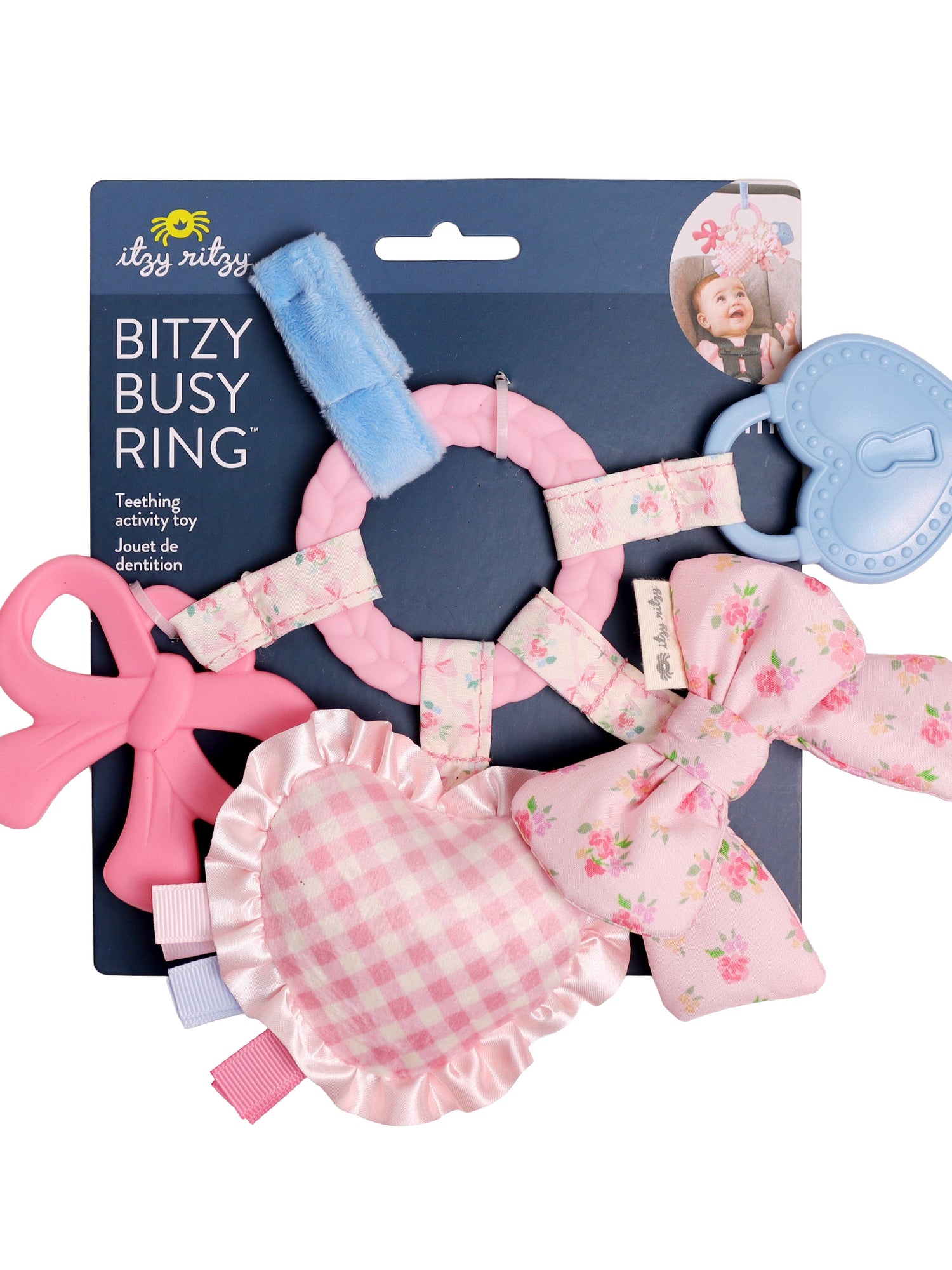 Teethe, Play & Explore! A sensory sensation, our Bitzy Busy Ring has all the love in the details with developmental features for baby to explore. Textured teethers and dangling toys that jingle, crinkle, and delight—easily attach this toy to baby’s car seat or stroller for adventures ahead!