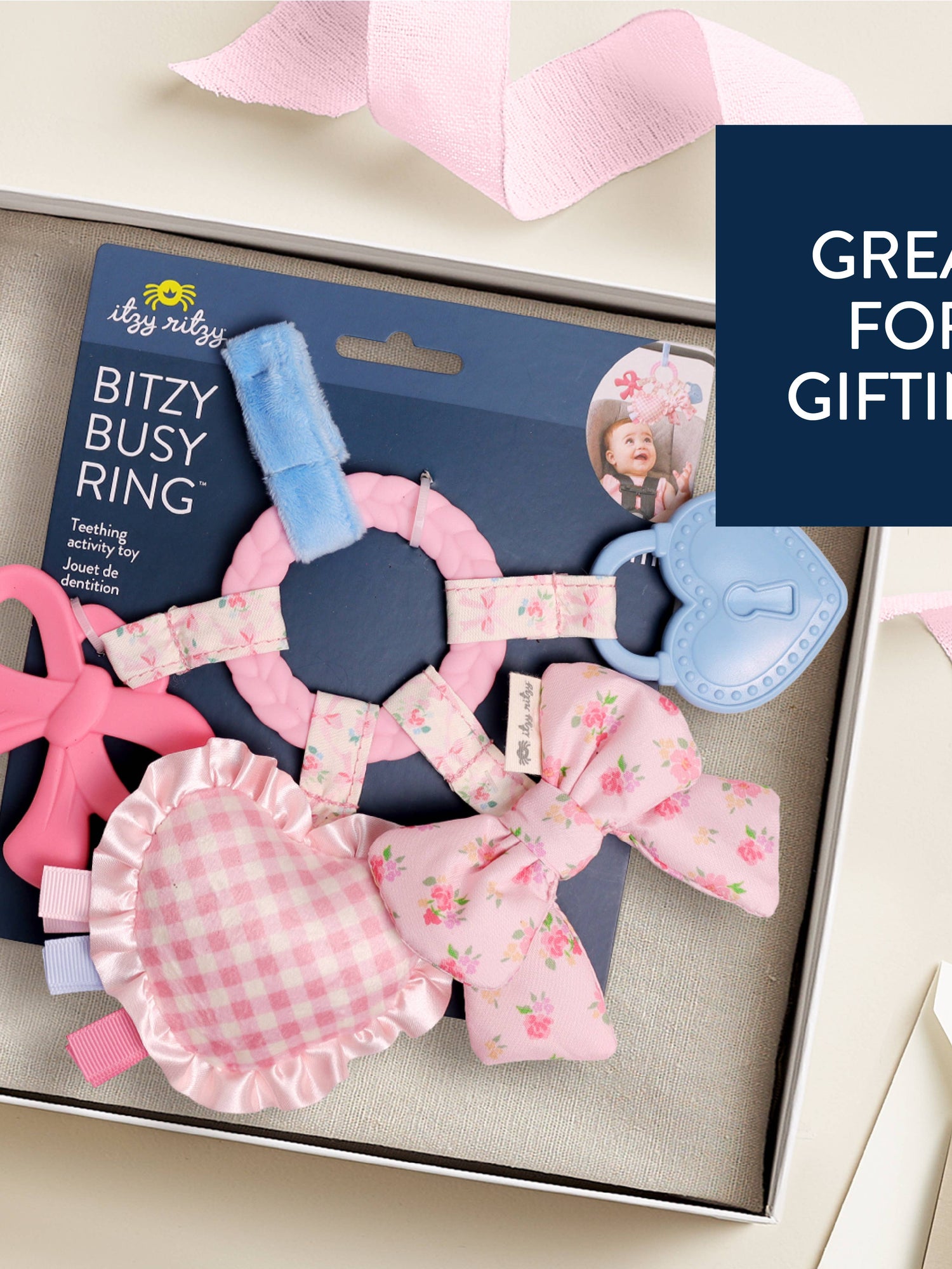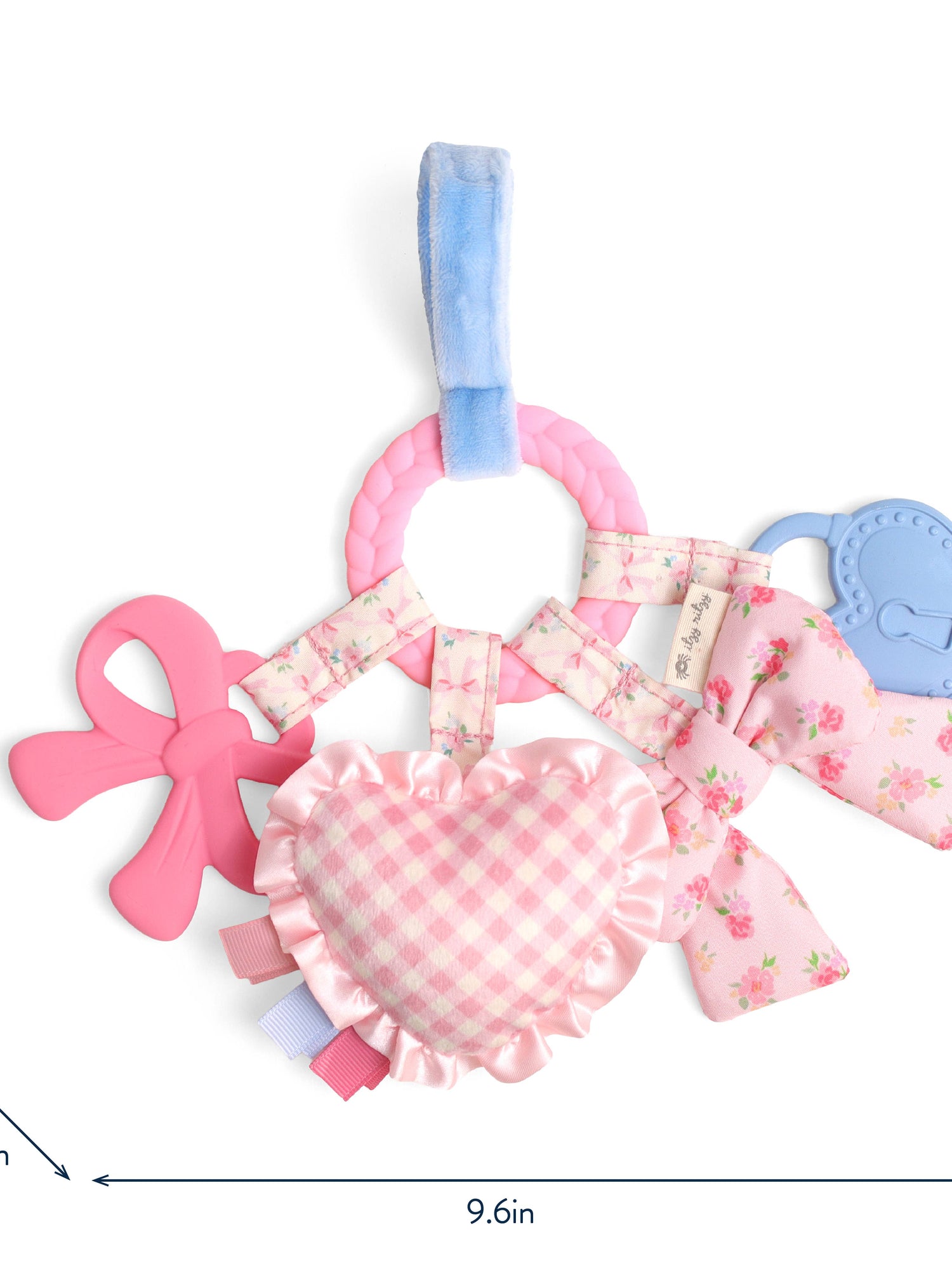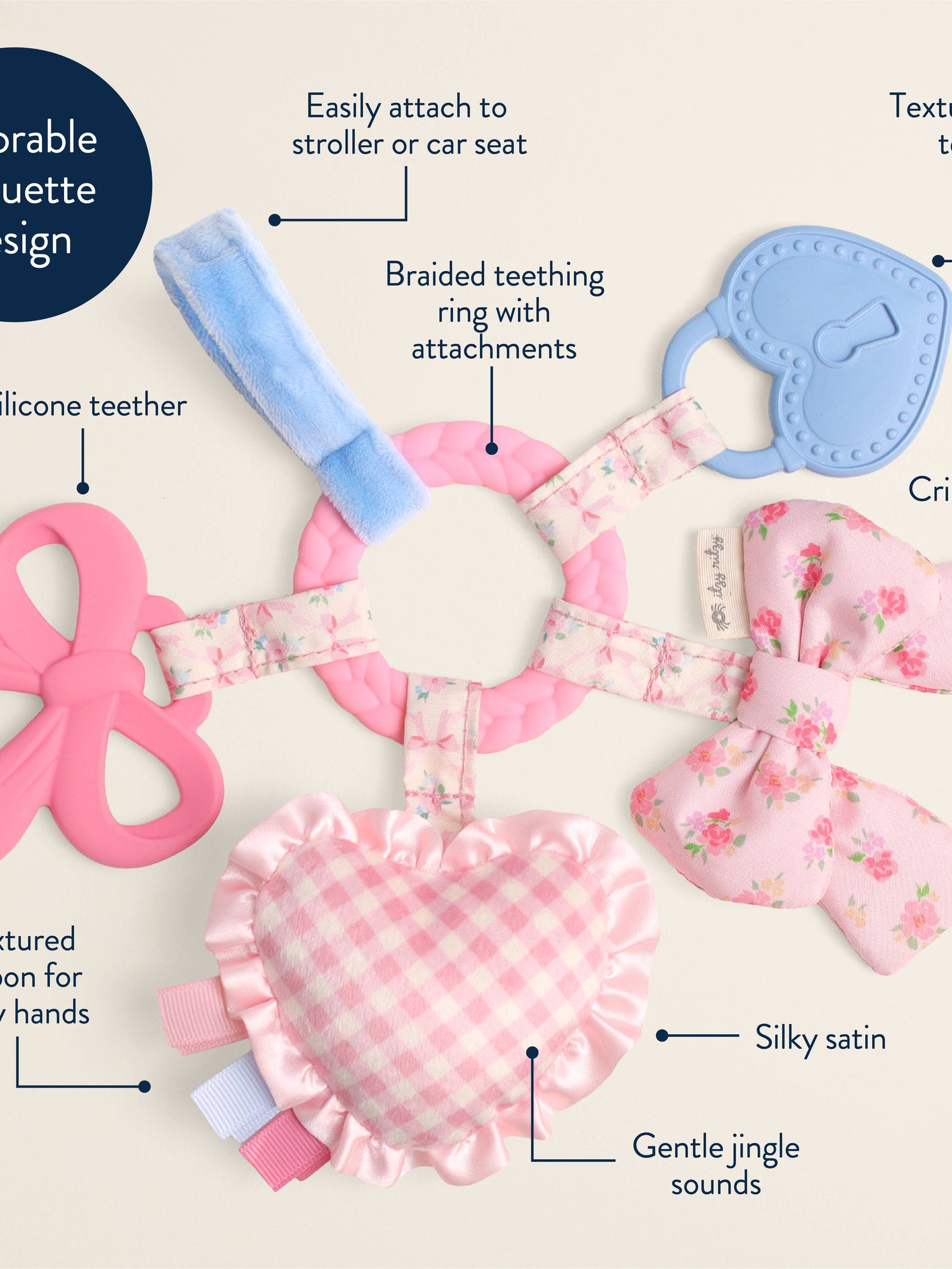 Teethe, Play & Explore! A sensory sensation, our Bitzy Busy Ring has all the love in the details with developmental features for baby to explore. Textured teethers and dangling toys that jingle, crinkle, and delight—easily attach this toy to baby’s car seat or stroller for adventures ahead!