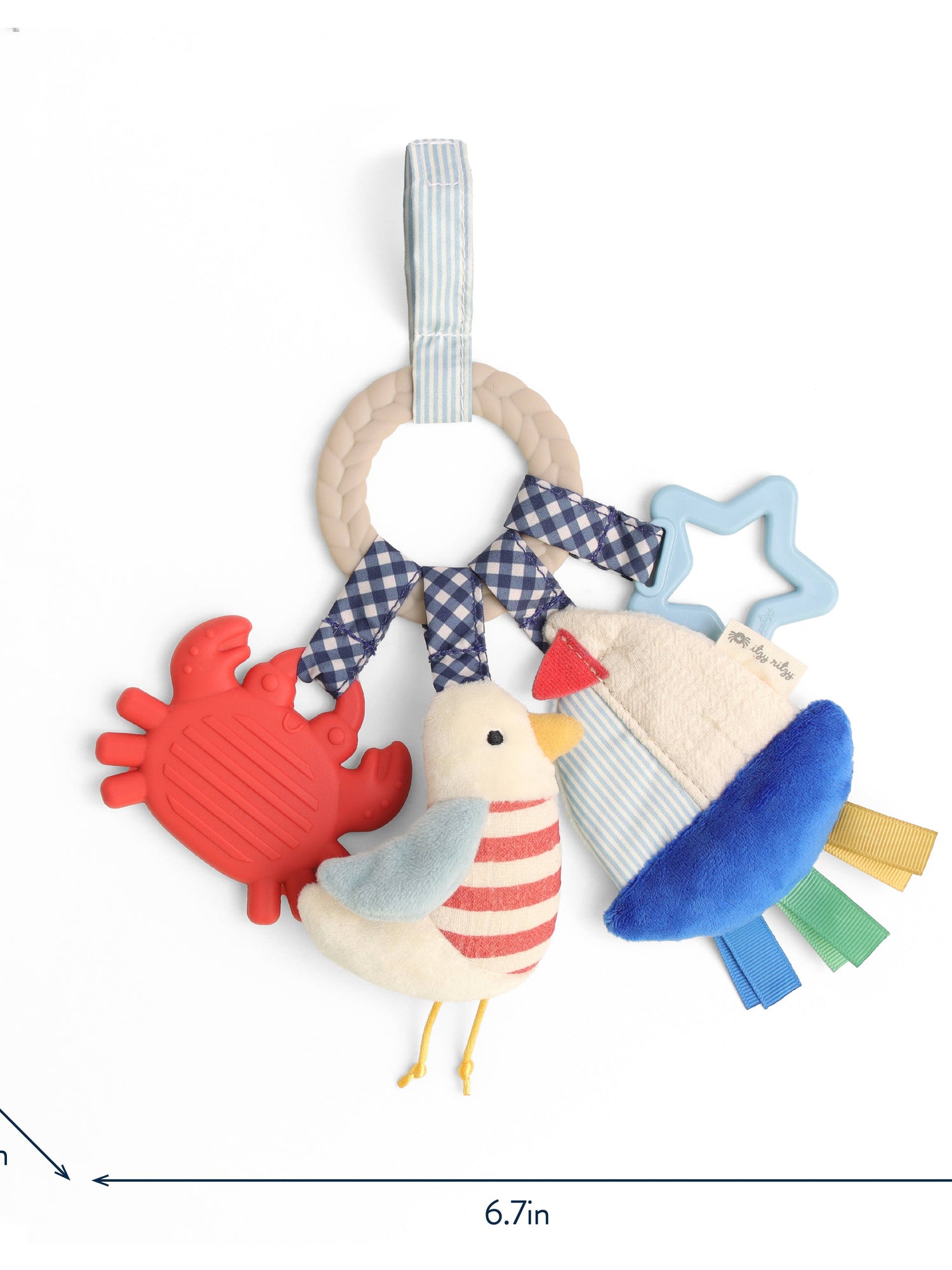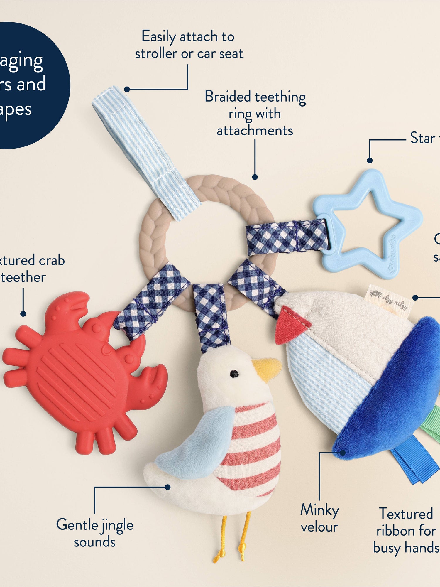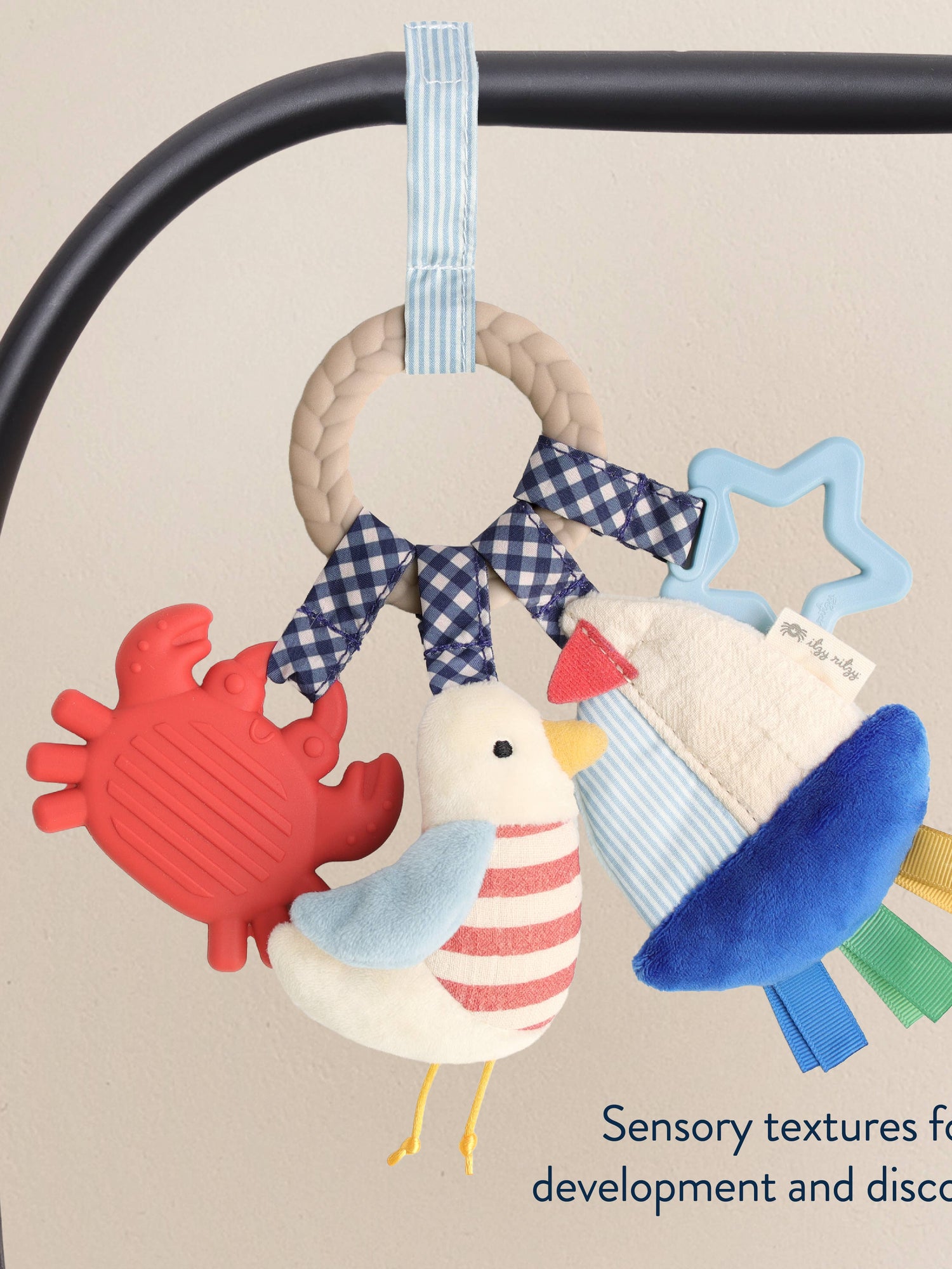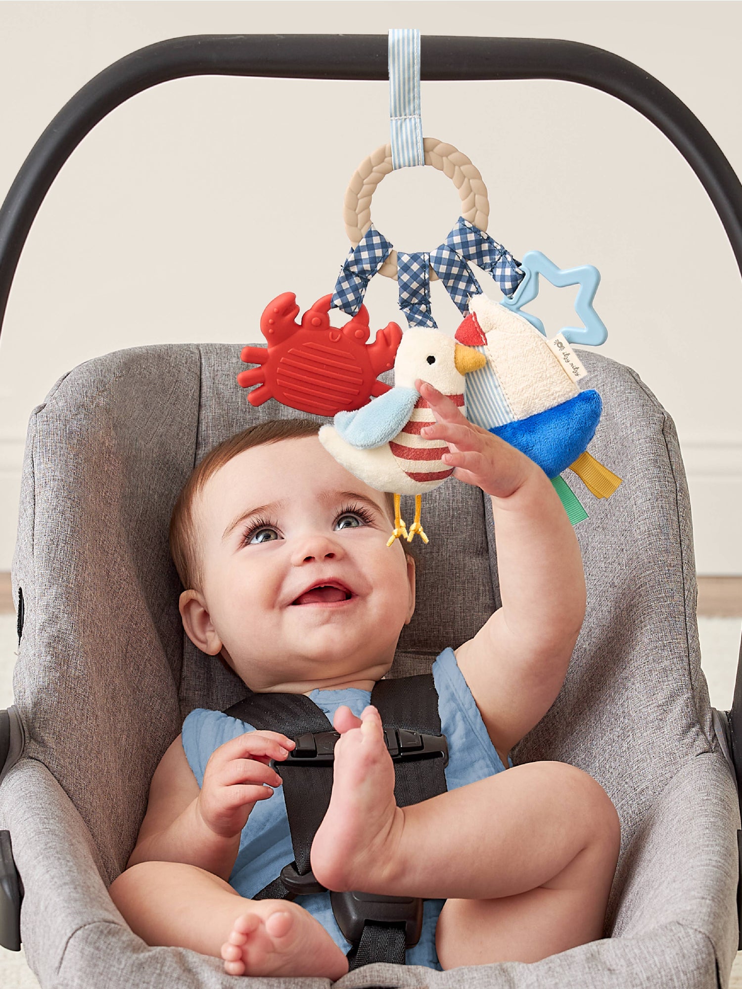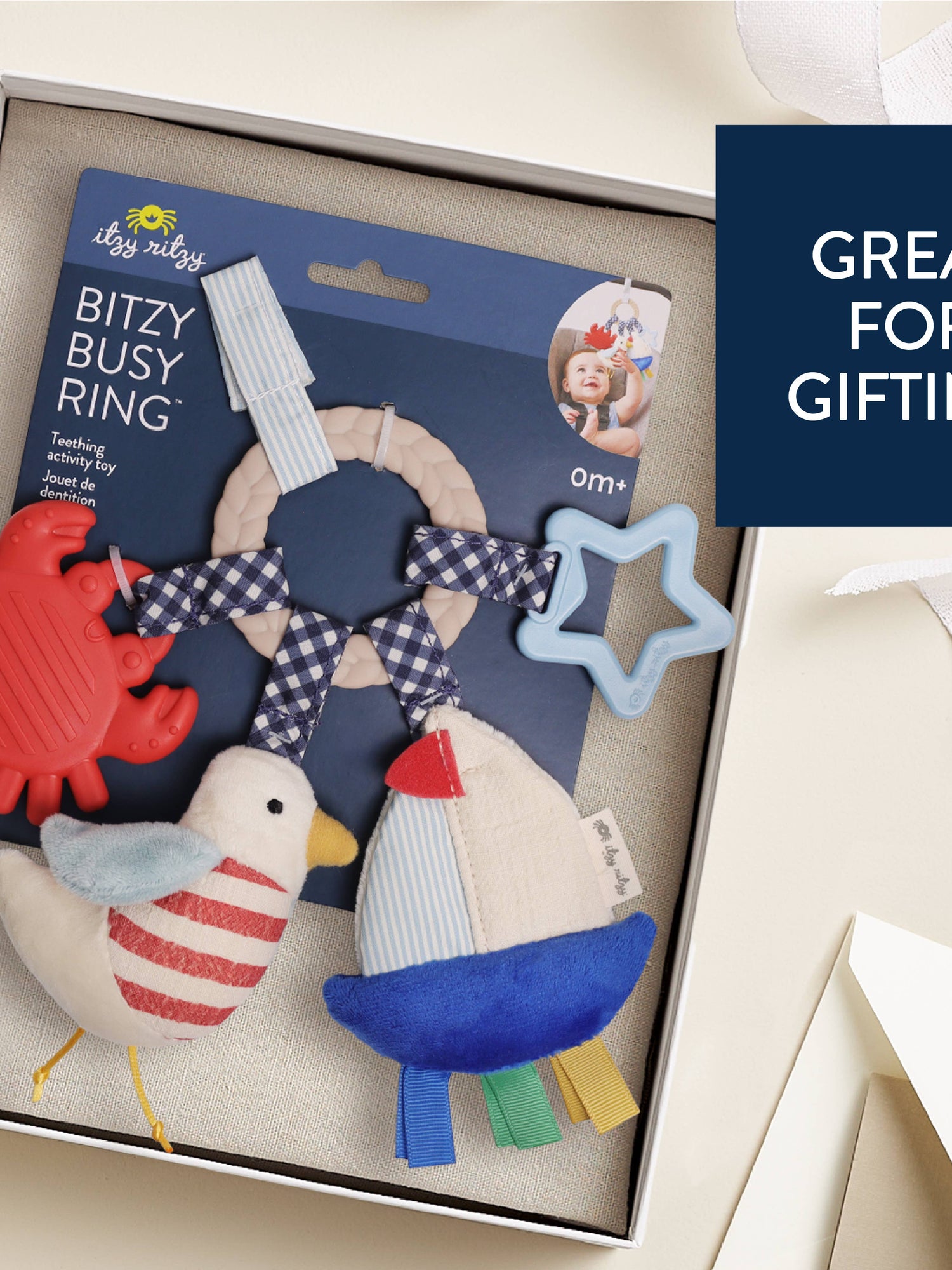 Teethe, Play & Explore! A sensory sensation, our Bitzy Busy Ring has all the love in thecdetails with developmental features for baby to explore. Textured teethers and dangling toys that jingle, crinkle, and delight—easily attach this toy to baby’s car seat or stroller for adventures ahead!