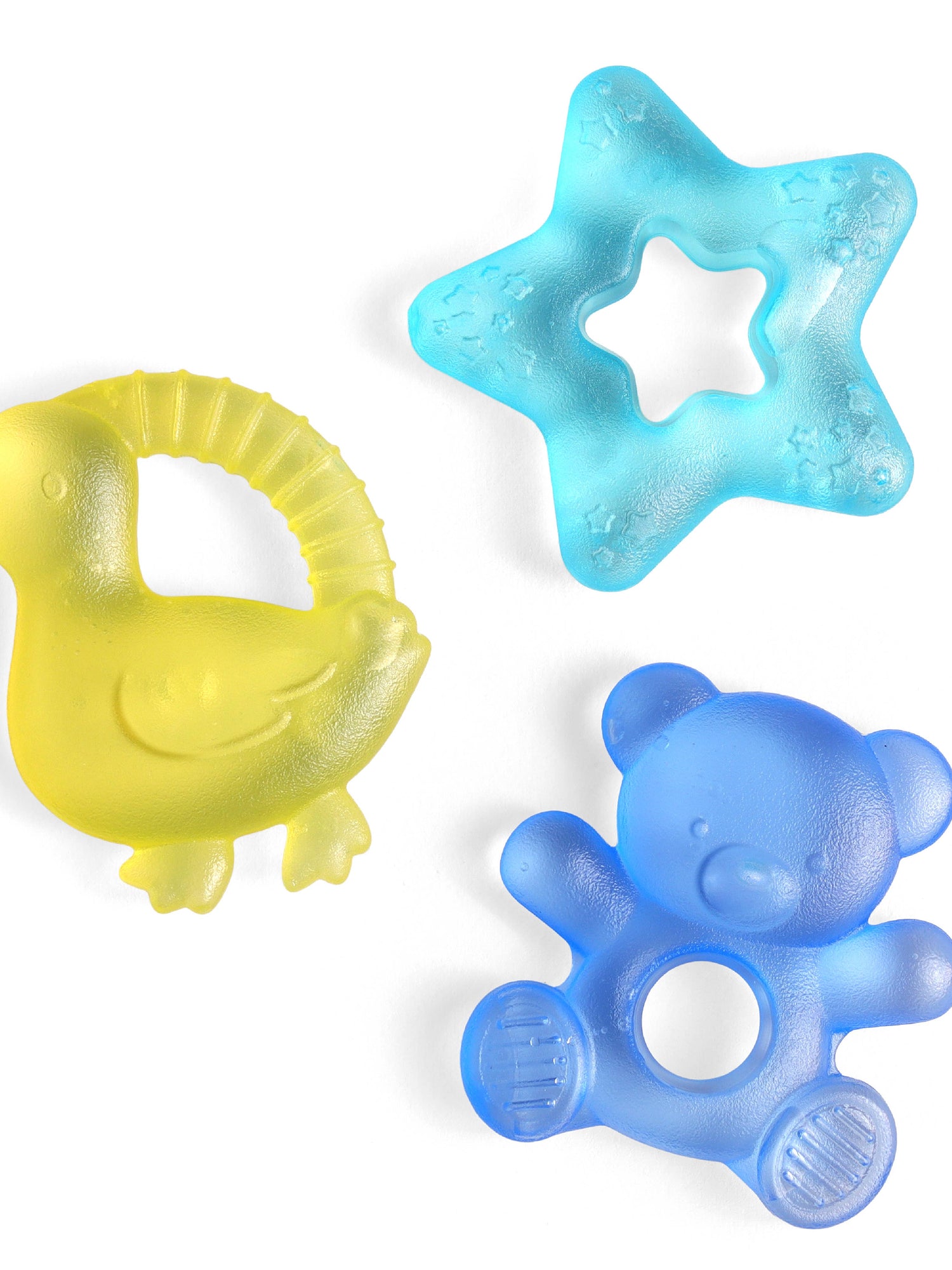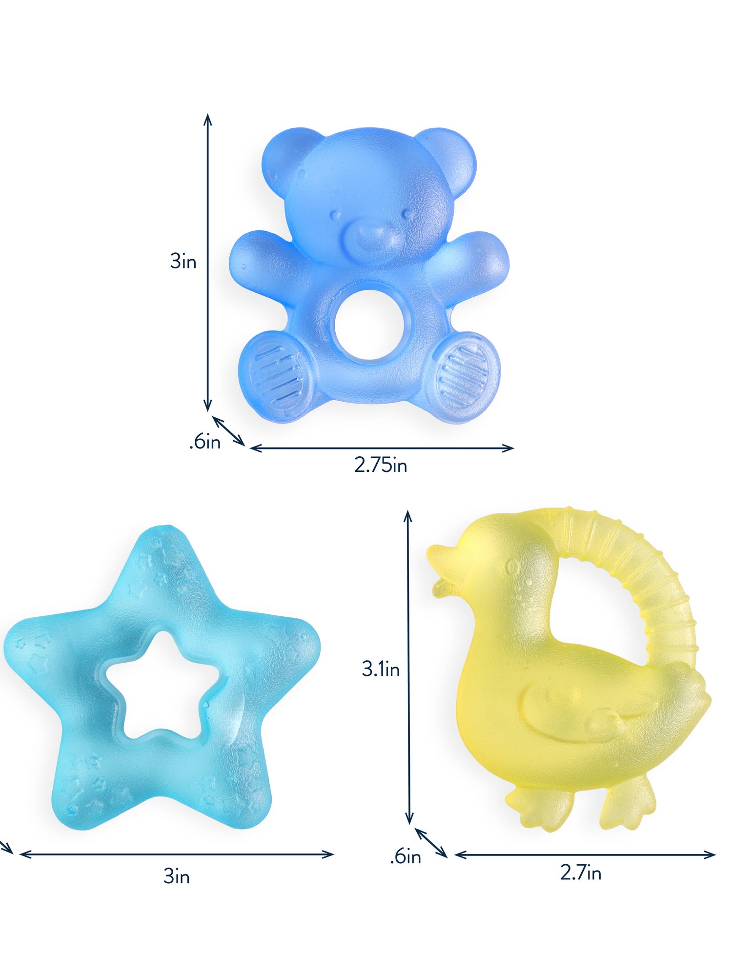 Help your little one keep their cool while teething with these adorable teethers! Our 3-pack of water-filled teethers are textured on both sides to help soothe sore gums, and they can be chilled in the refrigerator for extra relief. Their open shape is easy for baby to hold and their trendy designs make them even easier on the eyes!