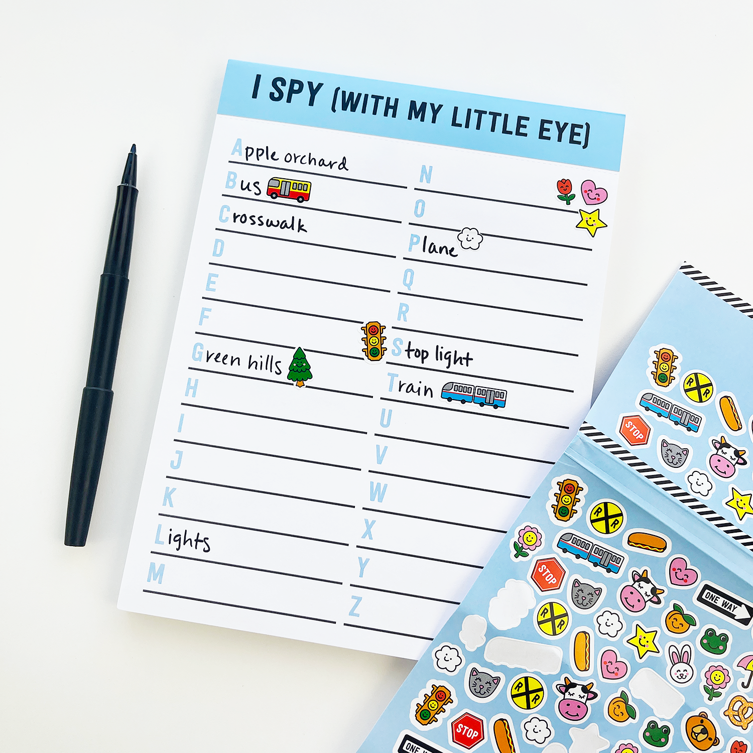 Includes one 65 page I Spy On-The-Go Pad with a 10" x 6" sheet of stickers