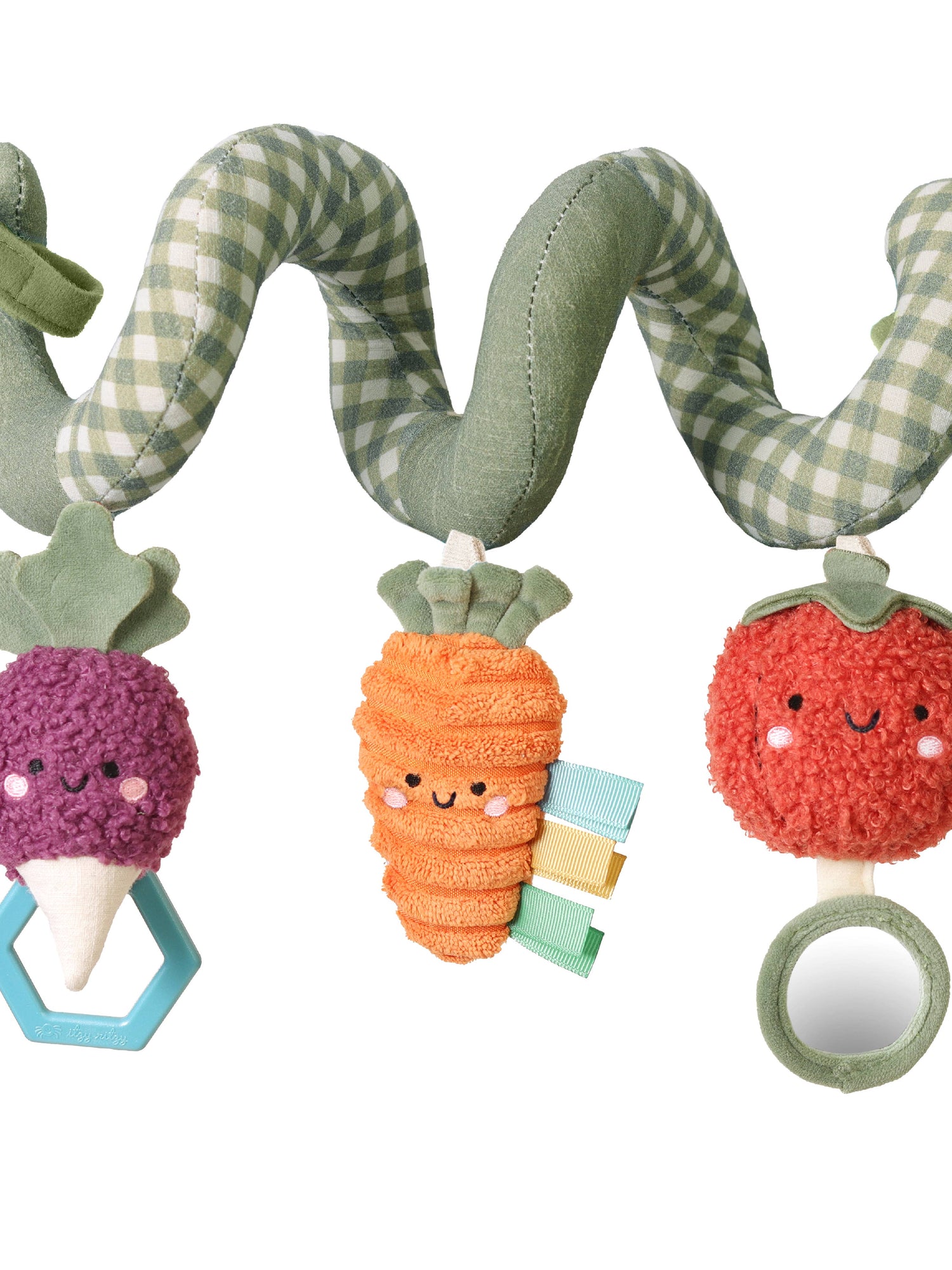 Endless adventures await with your babe’s new travel tagalong, the Itzy Bitzy Spiral™. Watch as your babe reaches for the dangling ring, smiles at their reflection in the hanging mirror, and grasps for the ribbons. Our natural cotton and soft velour fabrics are gentle to baby’s touch. For the many travels ahead, easily attach the Itzy Bitzy Spiral™ to your car seat and stroller for fun on-the-go!