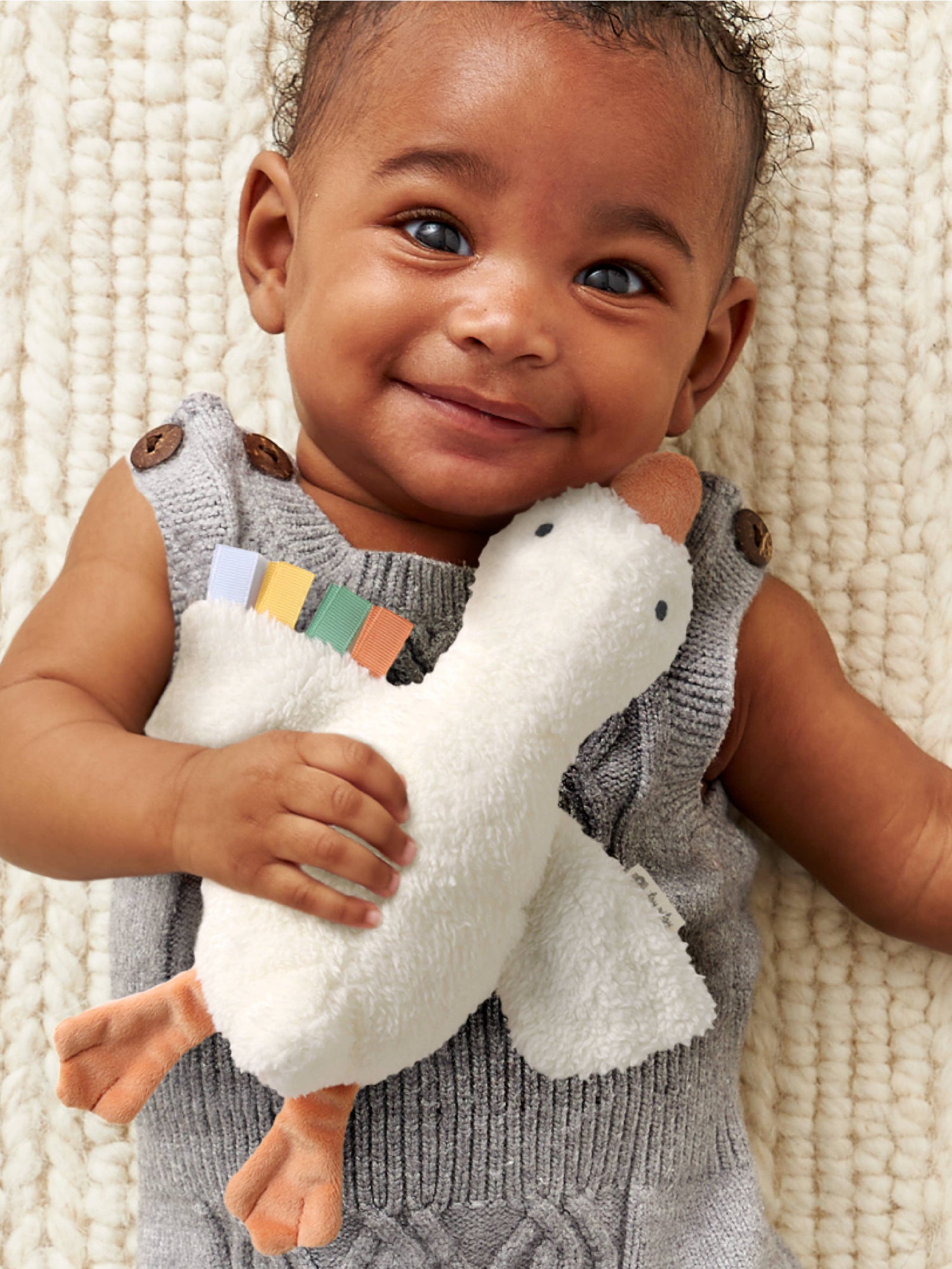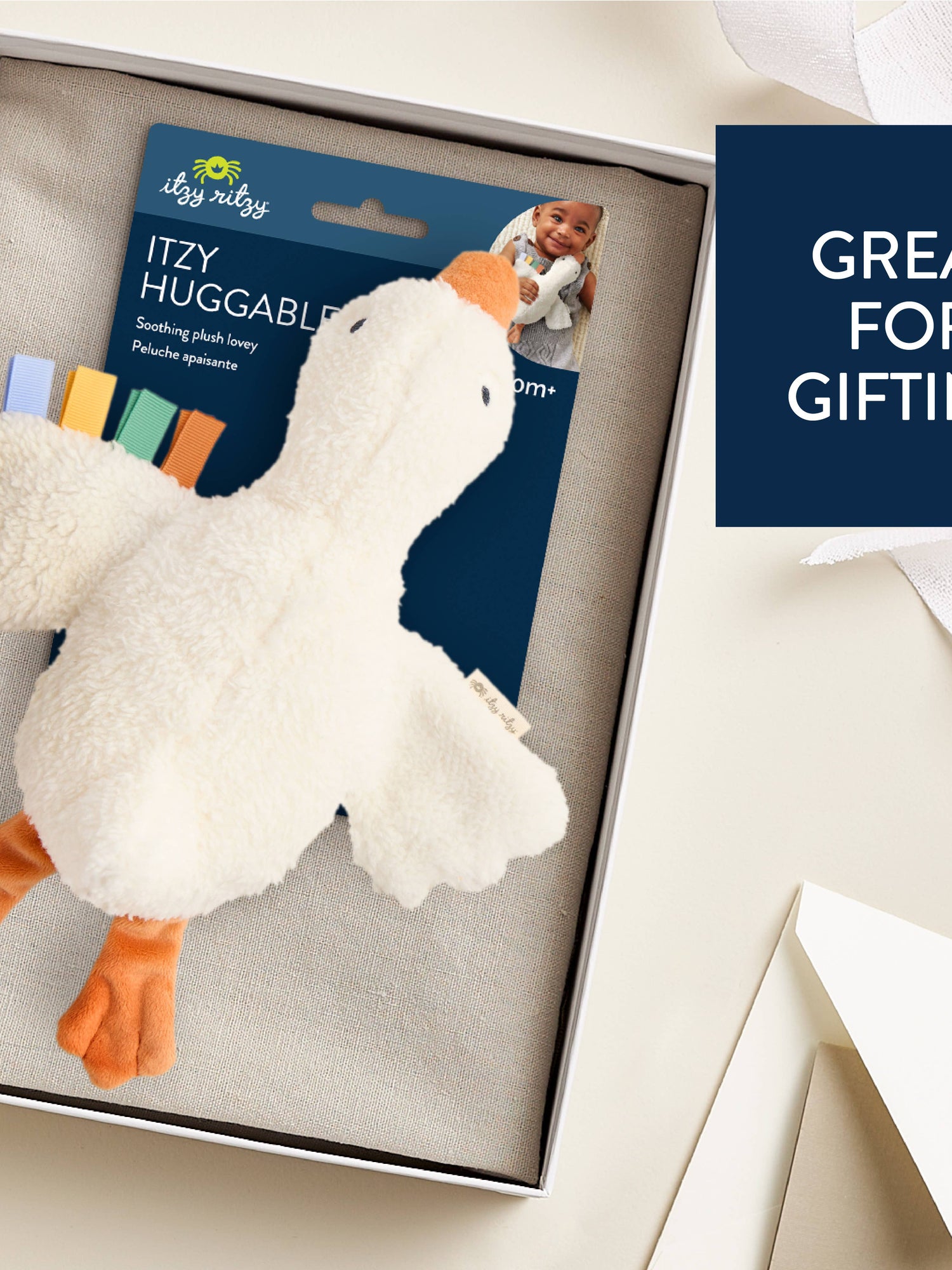 Gracie the Goose! The perfect pal for little hands to hold, meet the Itzy Huggable™! Made with baby-soft fabric, Gracie the Goose is snuggly and soothing. Whether it’s playtime, tummy time, or nap time, Gracie is always there for a hug.