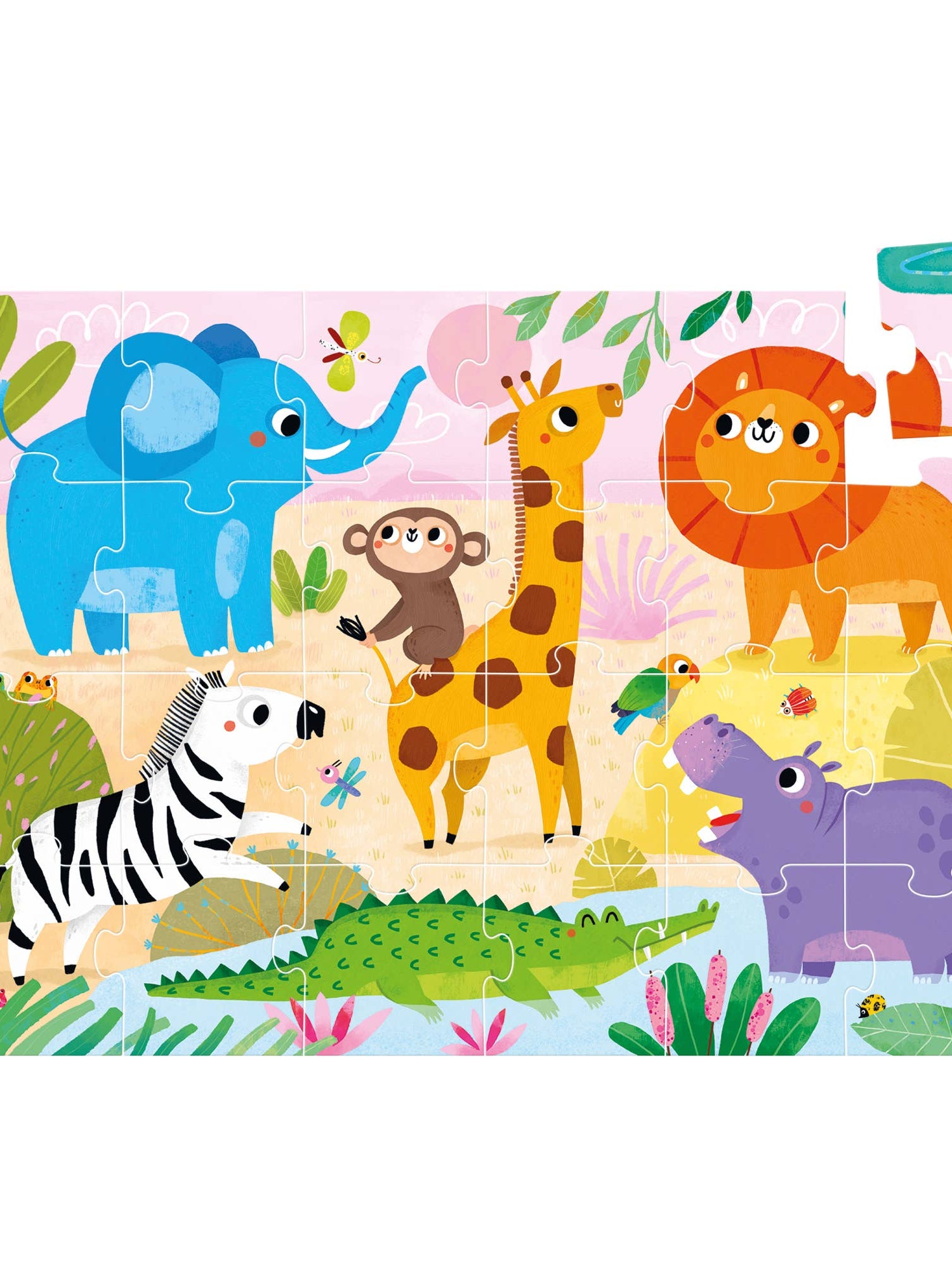 This large, beautiful illustration features well-known and beloved wild animals from the African savanna, perfect for young explorers. Who will you invite to join in the fun and embark on a puzzle adventure?