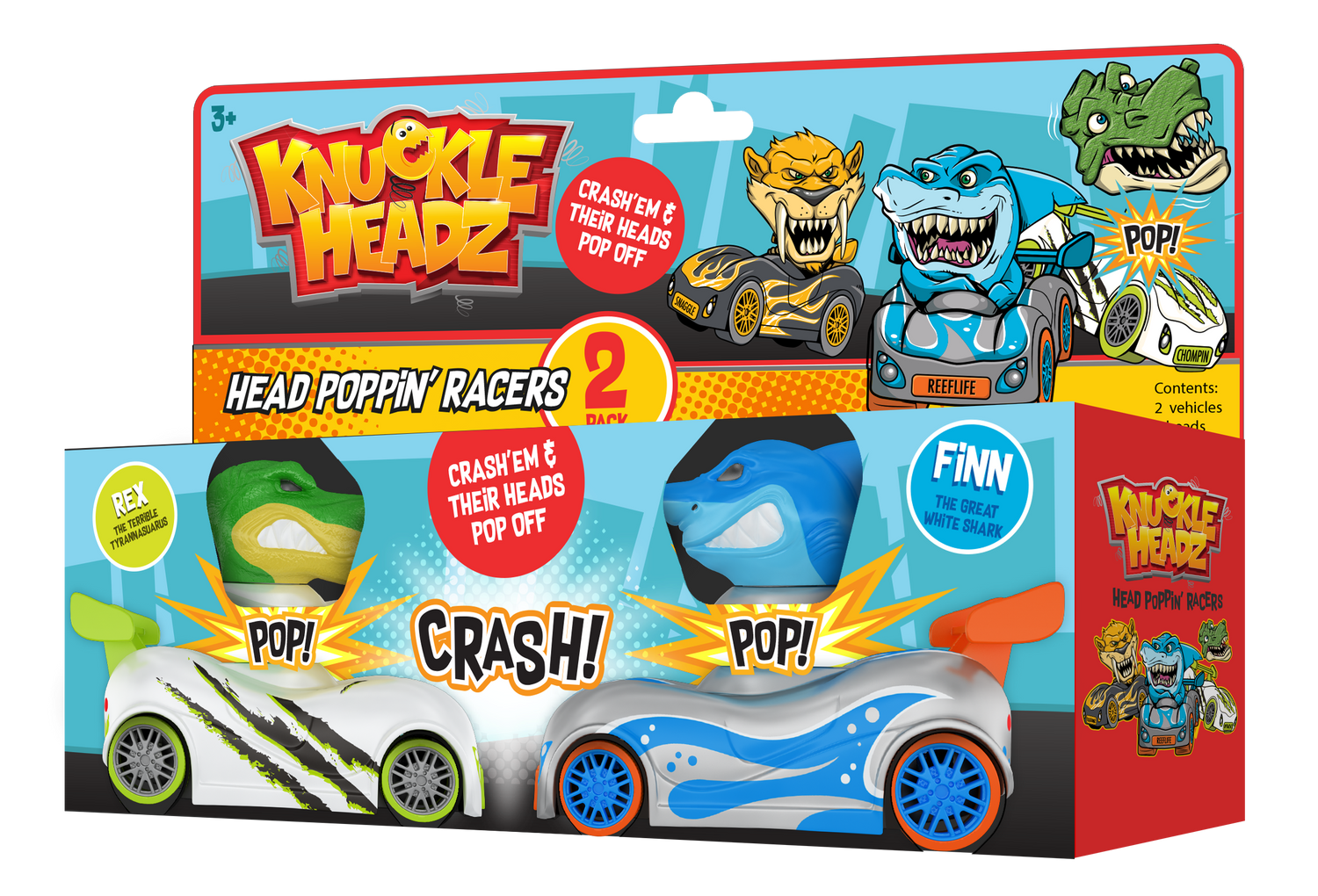 Knuckle-Headz Head Poppin™ Racers are fueled by a powerful pull-back motor, Knuckle-Headz simulates medieval jousting with a few modern twists. Six exciting new collectible characters face off in a battle to see which can keep its head. Define the battlefield, aim your vehicle at your opponents, pull back for maximum momentum, and let them zoom toward each other. Direct hits result in the loser’s head popping off about 12 inches. Each vehicle Includes a high-powered pull-back motor which zooms more than 30 feet.