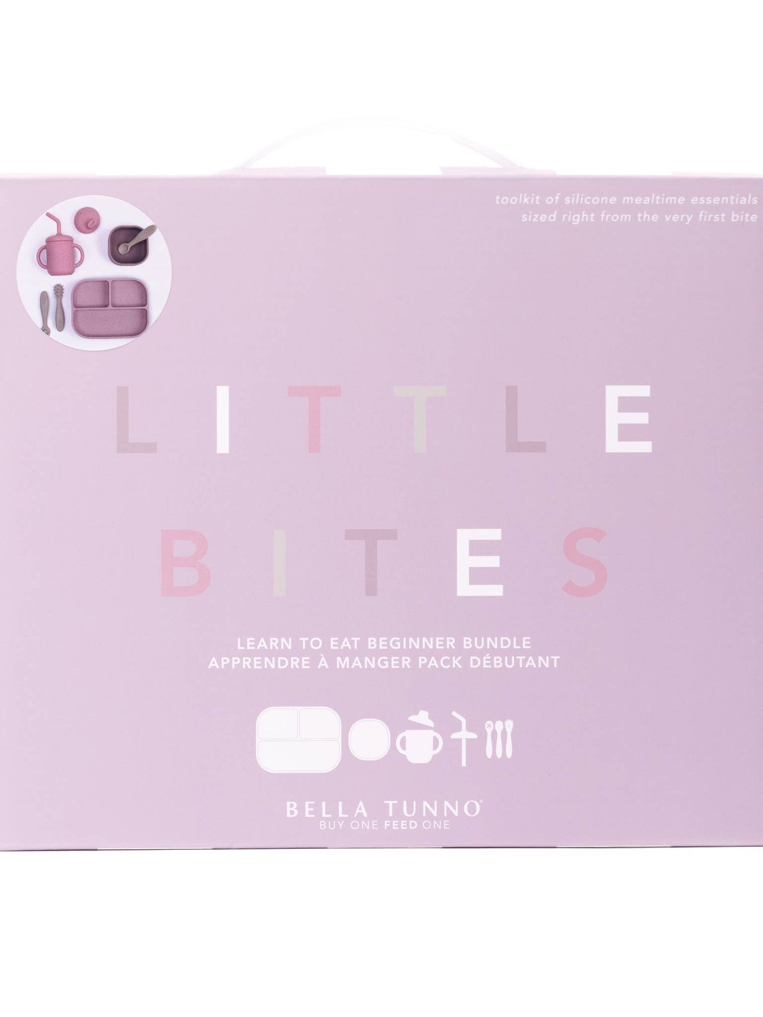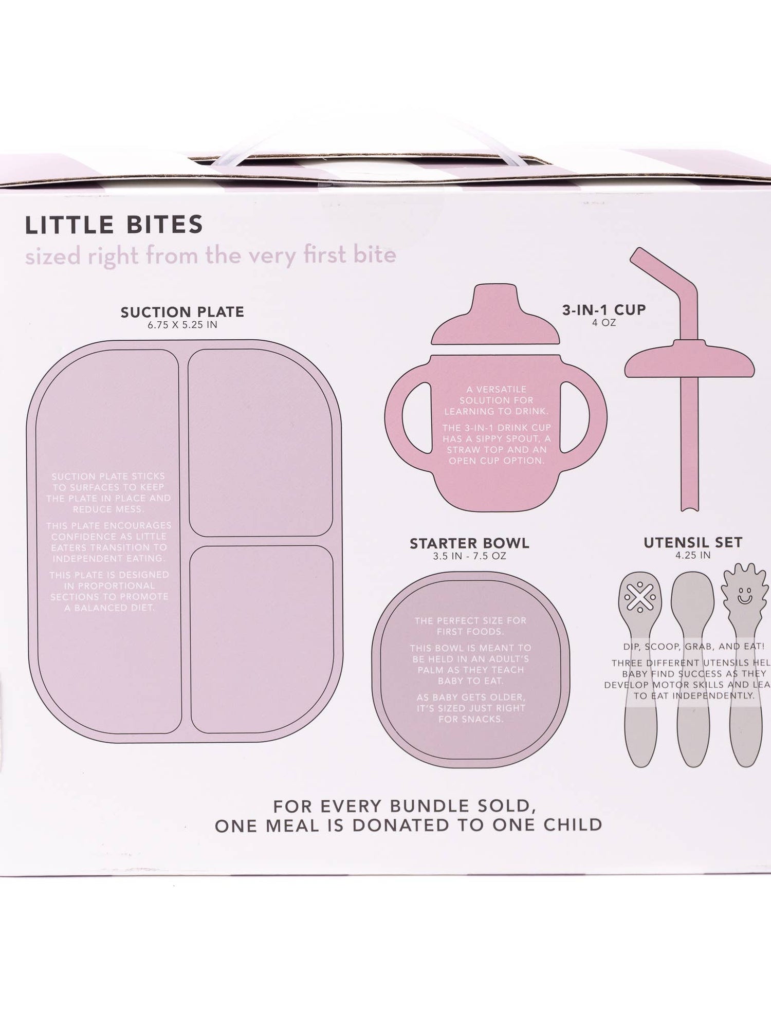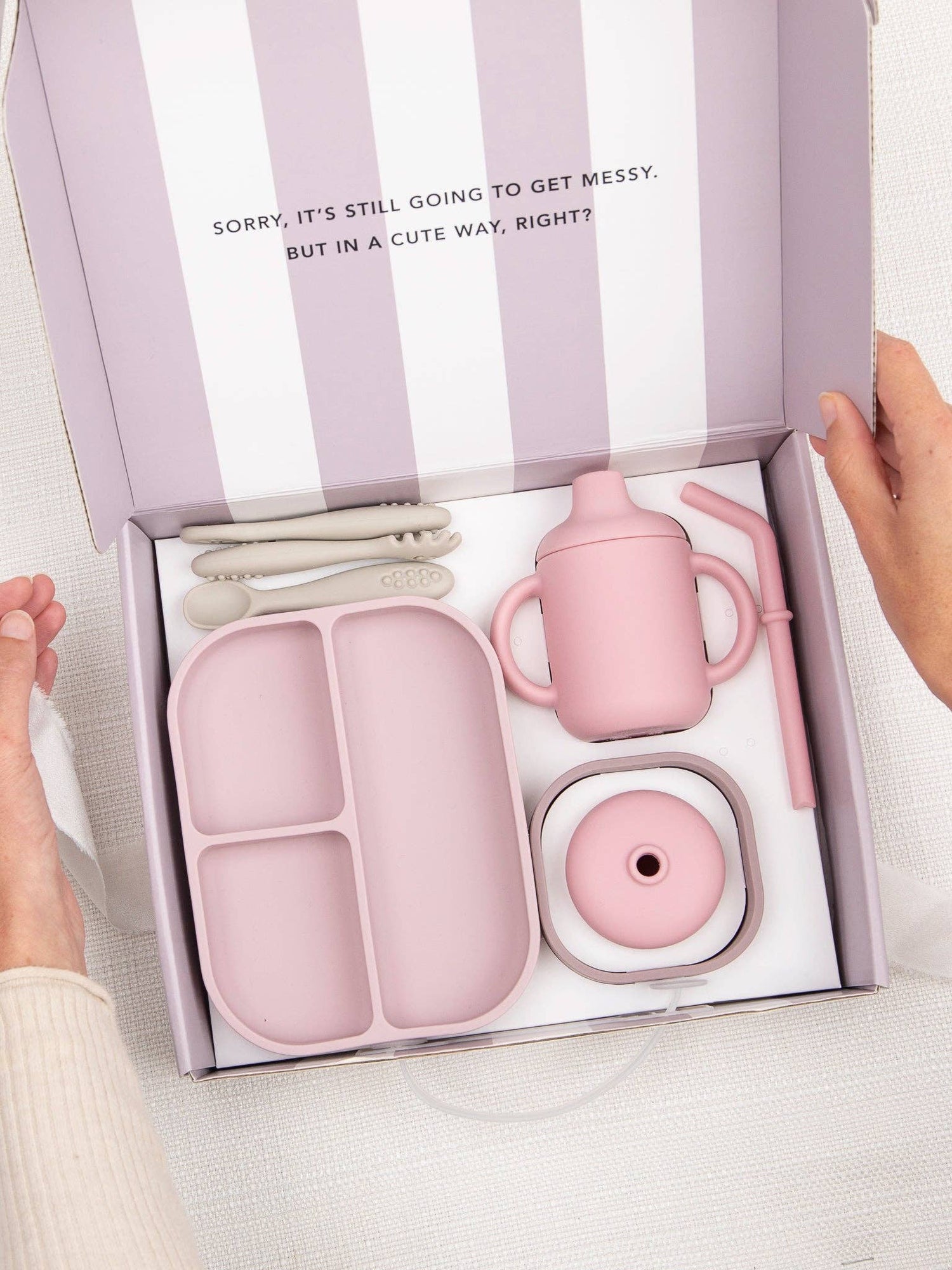 One set includes everything you need: 1 cup, 2 lids, 3 utensils, 1 suction plate, and 1 starter bowl in a ready-to-gift box (10.75" x 8.75" x 2.75").