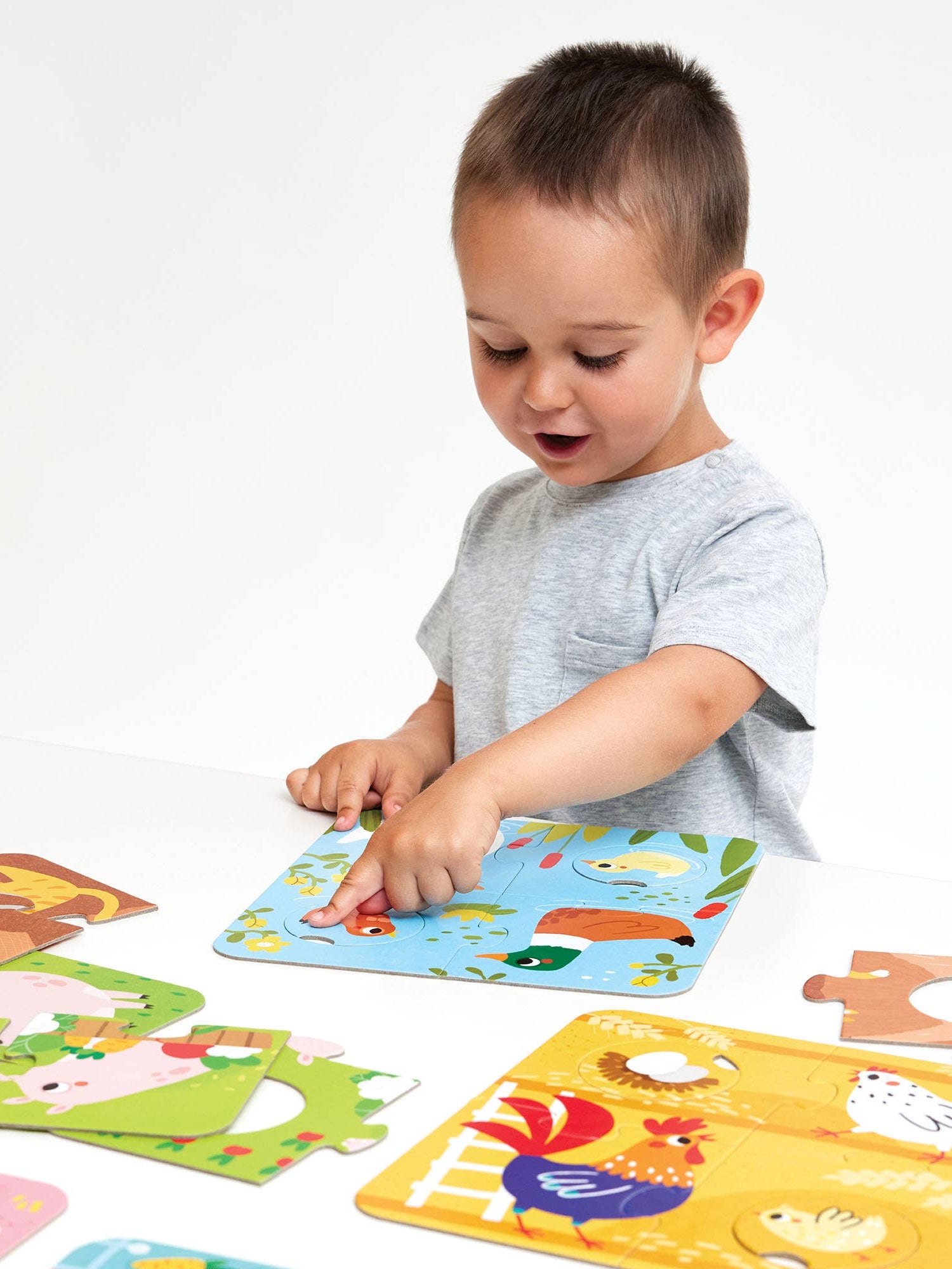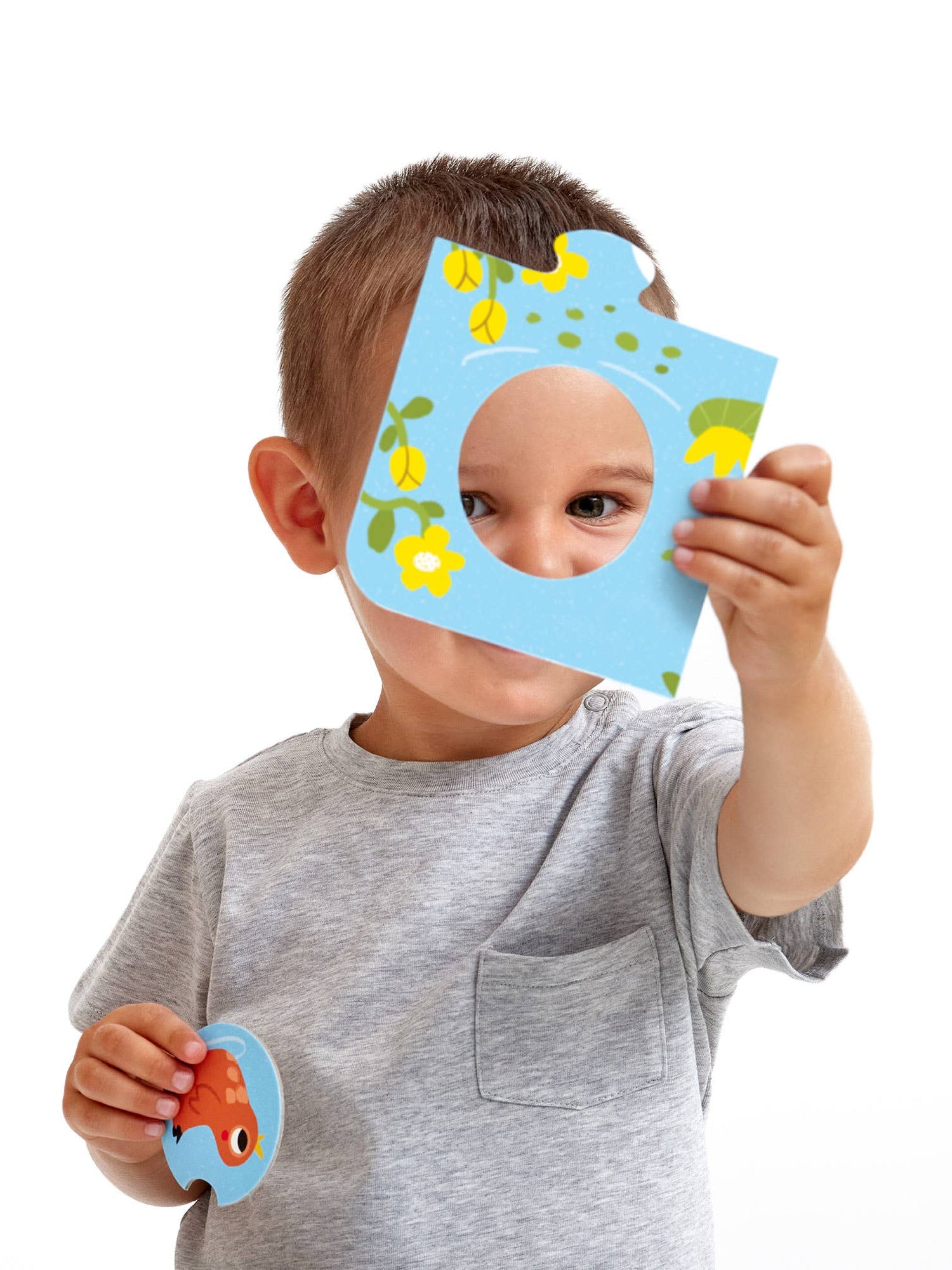 This education set includes 6 large puzzles with removable circular pieces that can be inserted interchangeably. Have fun together while training manual dexterity, perceptiveness and concentration.