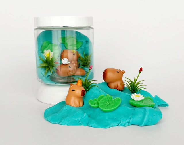 Includes: 4 oz Light Blue (Blue Hawaiian) KidDough, Swimming Capybara, Sitting Capybara, Lily Pad Charms, Cattail Plants
