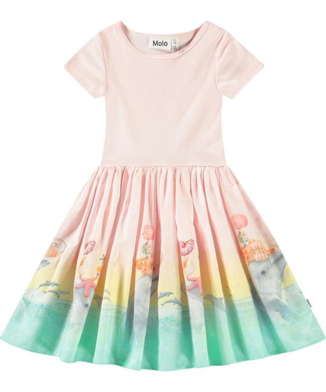 Pink short-sleeved dress in organic cotton with a fitted ribbed jersey top and poplin skirt. The dress has a regular fit with a colourful print on the skirt of playful dolphins in the sea.