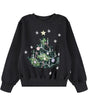 Black sweatshirt made of organic cotton with a round neck and ribbed edges. The sweatshirt has an oversized fit. On the front, there is an embroidered multicoloured sequin Christmas tree.