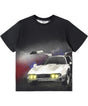 Black T-shirt made of soft organic cotton with short sleeves and a ribbed neckline. The T-shirt has a loose fit with a print of a certain race car.