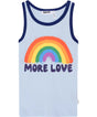Light blue, snug tank top in organic cotton. The top has a dark blue edge tape around the neck and armholes, and it has our iconic rainbow with the text 'More Love' printed on the front.