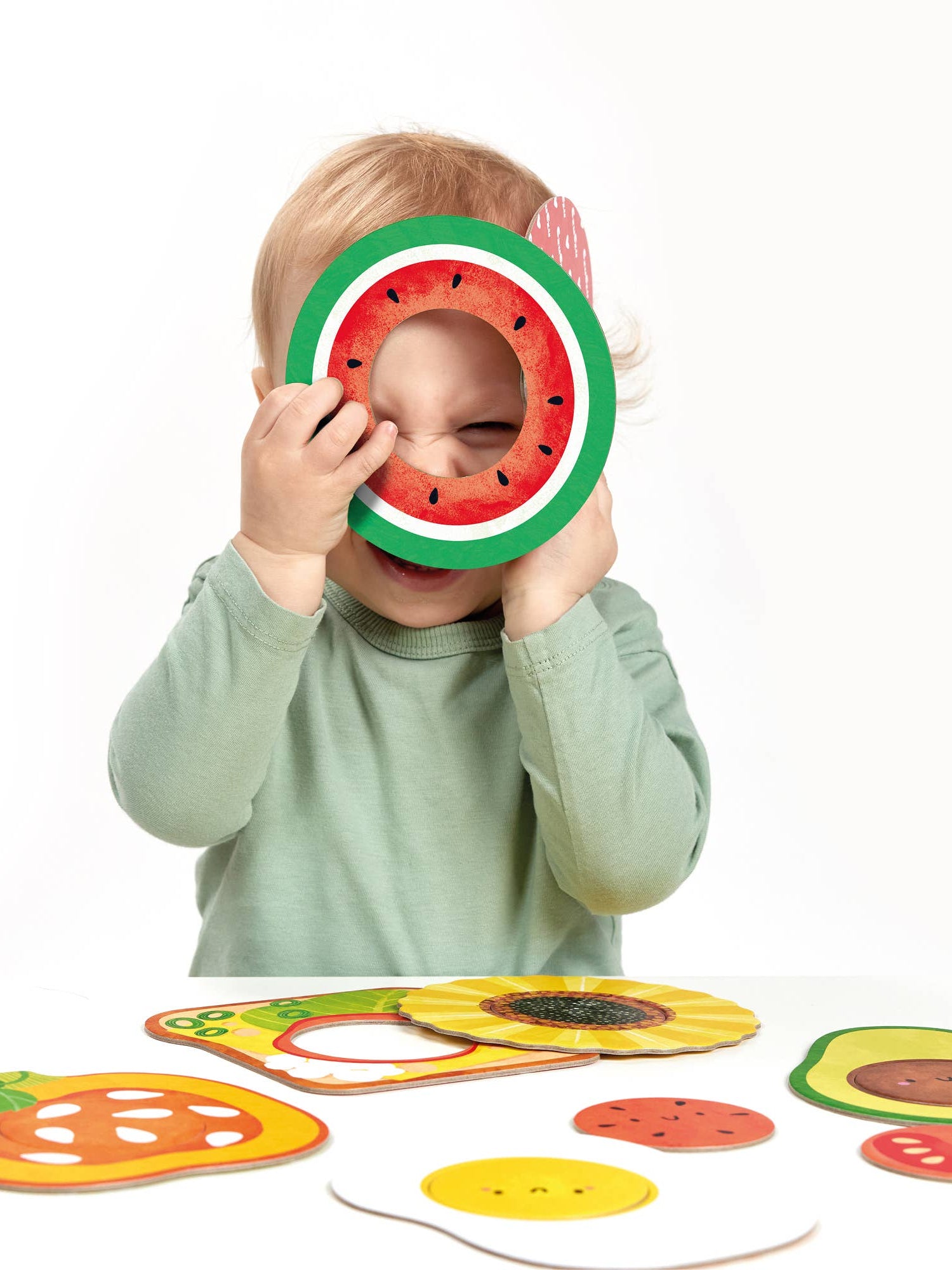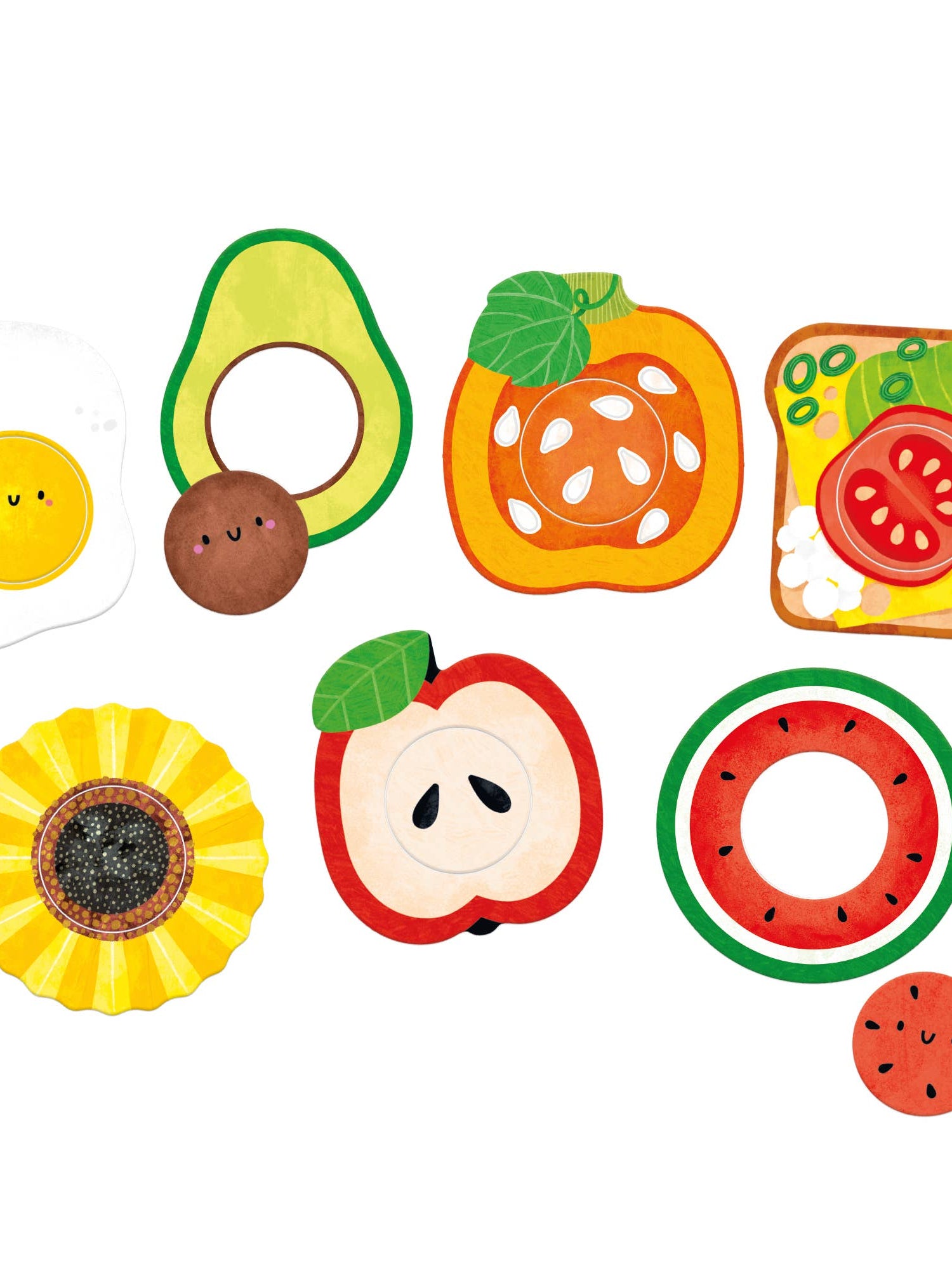 These large, vibrant puzzles feature yummy foods that little ones recognize, encouraging them to join in the fun. The interchangeable circles can be turned any way—right side up, upside down, or even backward—making this an ideal first puzzle set!