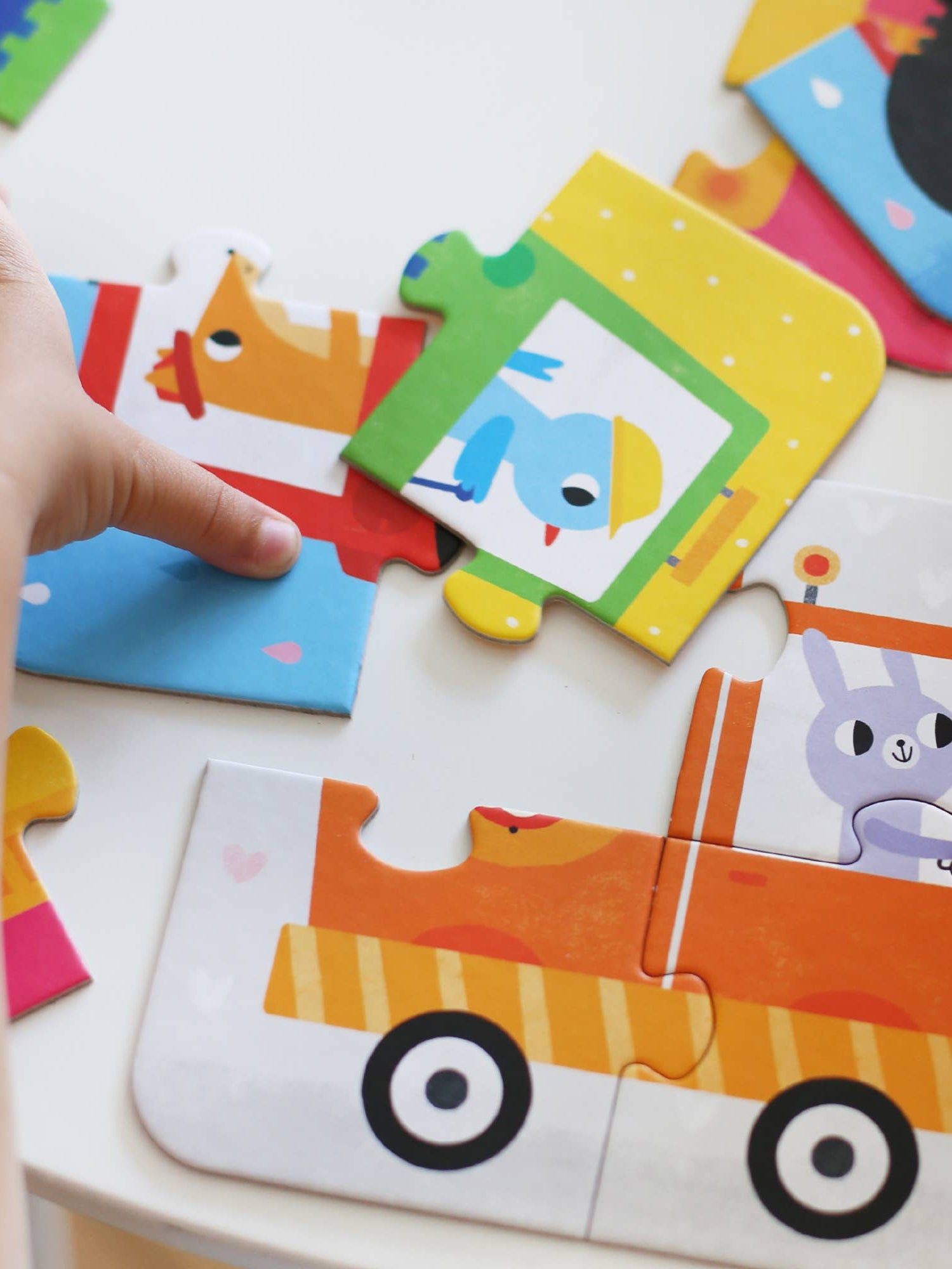 Vroom vroom! A set of 5 large 4-piece puzzles in a small box. Can be stacked or pegged in your store. Great impulse buy. Fire truck, tractor, digger and more.