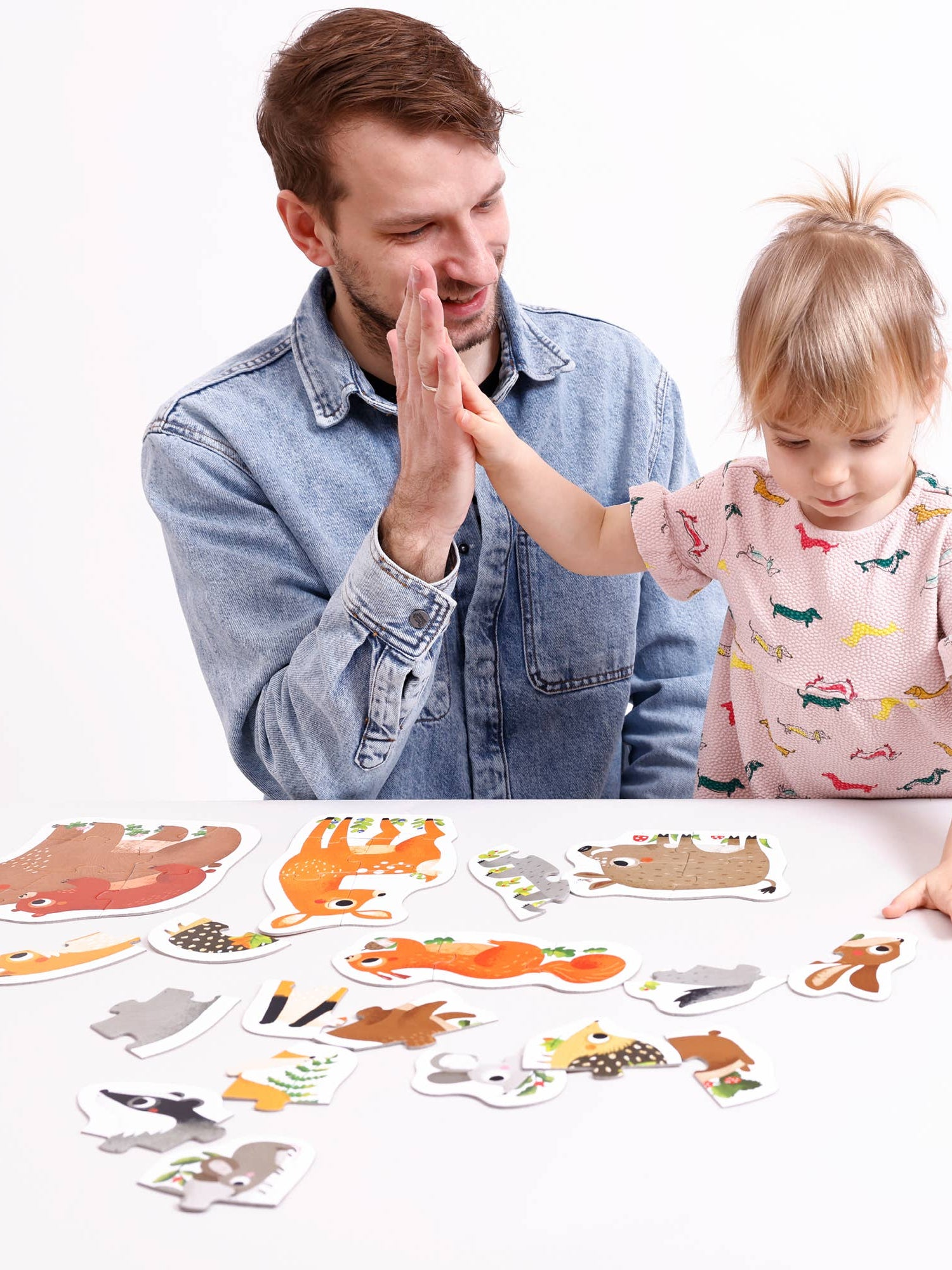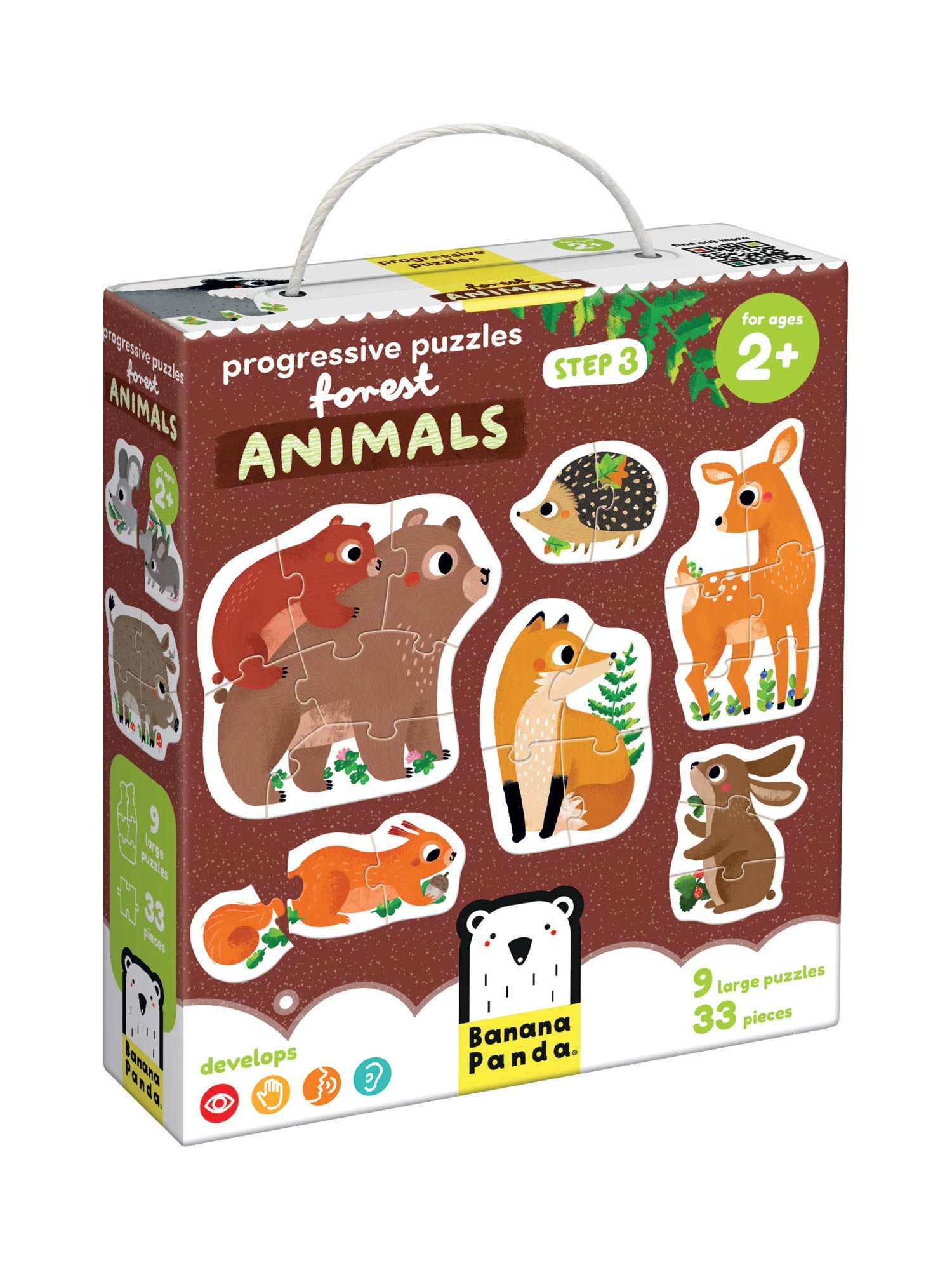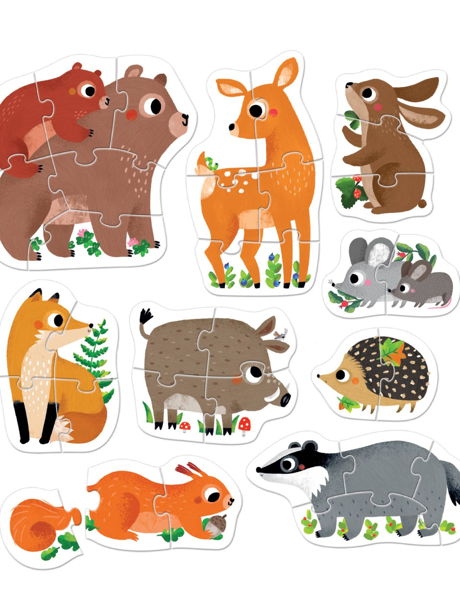 Meet these friendly forest animals! Fun with puzzles featuring various piece counts (2,3,4,5,6) allows children to gradually improve their assembly skills with puzzles of increasing difficulty. Total of 9 puzzles, 33 pieces.