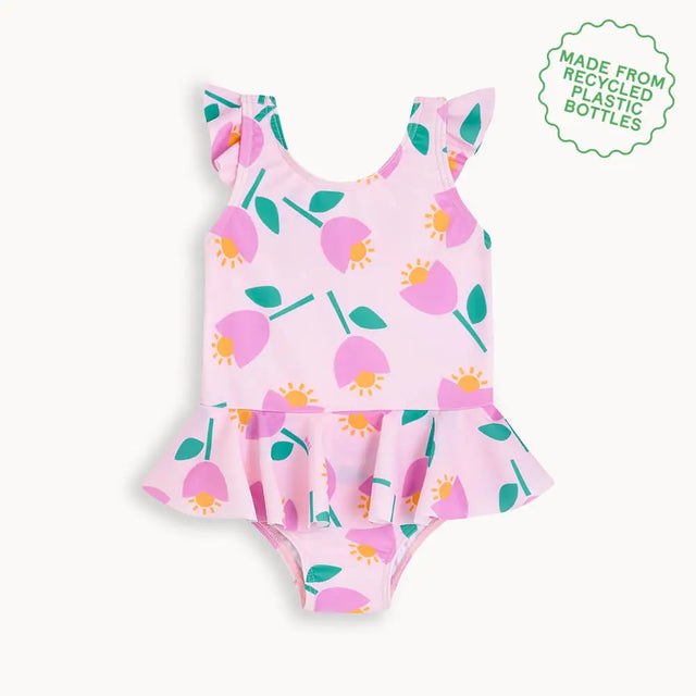 Make a splash this summer with our frill skirt infant & childrens swimsuit! A bright pink floral tulip print makes every day feel like a holiday, a frill skirt and shoulder adds extra sun coverage & a bit of fun. The quick-drying recycled polyester fabric makes it practical both in and out of the water and ensures ultimate stretch & comfort. Add our matching Regatta swim hat for an extra layer of protection.