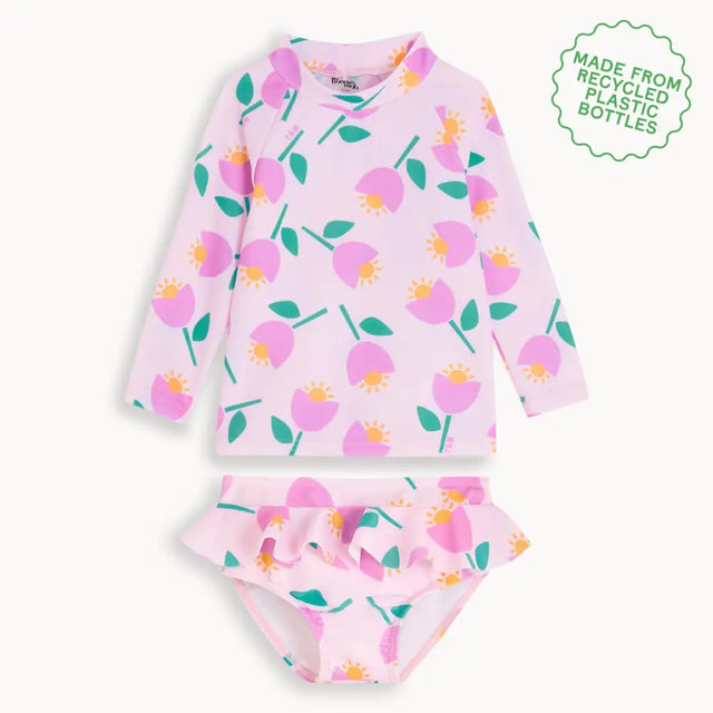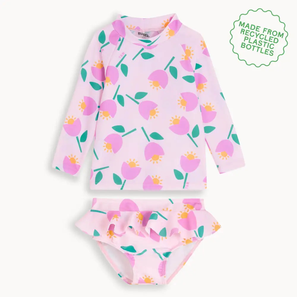 The ultimate stylish sun protection can be found in our recycled polyester baby & kids rash top and frill bottoms set. The Rocco top features long sleeves that assure great cover from the sun, while the Rialto bottoms add a frill for a fun, girly touch. The breathable, high stretch fabric lets your little one move and explore in and out of the water and cute pink tulip print keeps things fun. Add the matching Regatta hat for the perfect beach day outfit.