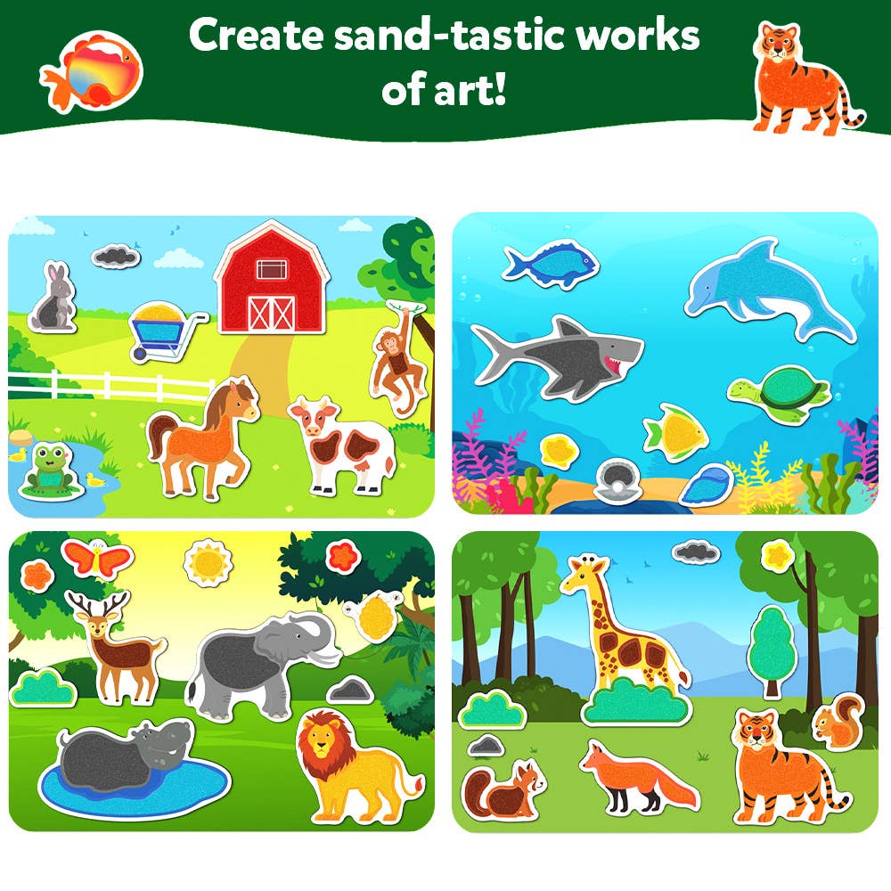 Unleash vibrant creativity with Sand-Tastic Art Animals by Skillmatics, the mess-free sand art kit that turns playtime into a colorful adventure. Kids use over 50 peel-and-stick sand stickers across four themed picture boards featuring adorable farm, jungle, and sea animals. Pour, press, and design with seven bright sand colors using the included dab sponge and magical rainbow pen. The mess-control tray keeps everything tidy, making this a stress-free activity parents will love. Ideal for ages 4 to 10, this educational art set supports fine motor skills, focus, and color recognition while sparking artistic expression and screen-free fun.
