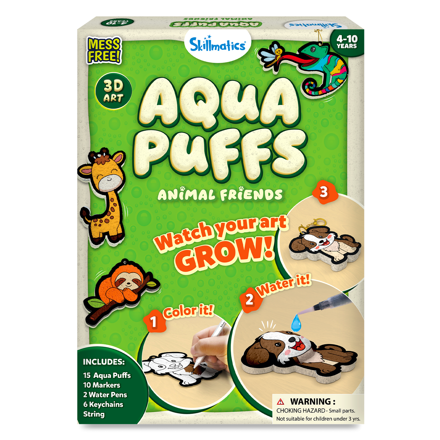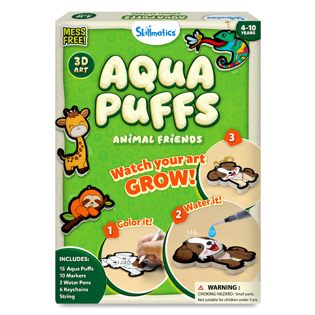Discover the magic of 3D art with Aqua Puffs Animals, a revolutionary craft kit where flat designs transform into puffy, touchable creations! Kids simply color adorable animal designs with included markers, activate them with water, and watch in amazement as their artwork puffs up into dimensional masterpieces. This award-winning craft activity combines coloring, water play, and creative expression into one unforgettable experience. Perfect for children who love hands-on projects, these finished puffs become wearable accessories, backpack charms, or bedroom decorations. With everything needed in one complete set, this mess-free activity delivers hours of creative fun without scissors, glue, or cleanup. Recognized as a 2025 Parents Best Toys Award winner, Aqua Puffs Animals offers screen-free entertainment that kids ages 4 to 10 will love. Each kit provides multiple crafting sessions, making it ideal for playdates, rainy days, birthday parties, or quiet afternoons at home.
