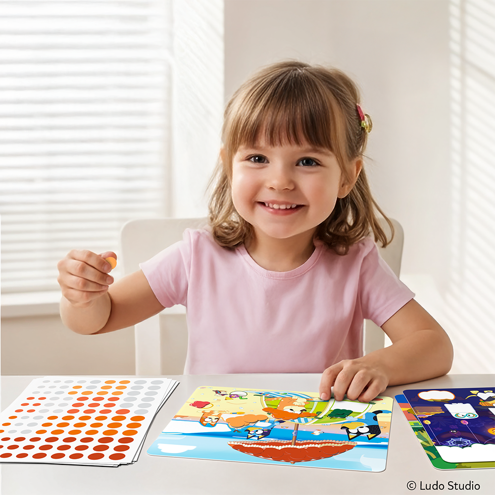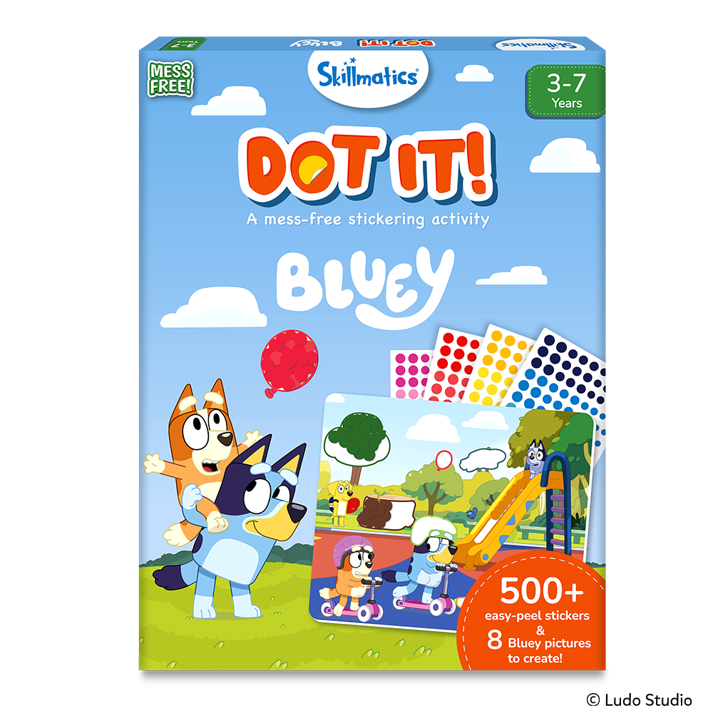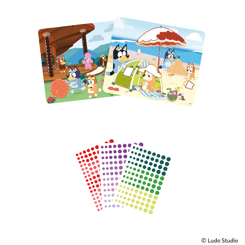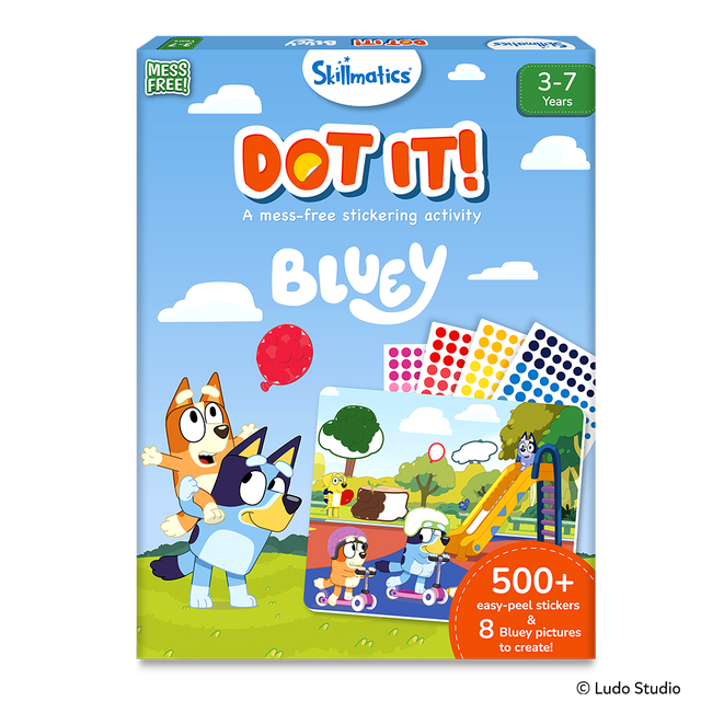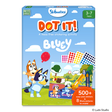 Bring home the fun of Bluey with this engaging sticker art activity that lets young fans create colorful scenes featuring their favorite characters! Dot It! Bluey includes 8 double-sided picture canvases showcasing Bluey, Bingo, Bandit, Chilli, and the whole Heeler family in playful scenes kids will love. With over 500 easy-peel dot stickers in various colors and sizes, children use fine motor skills and creativity to complete each picture by matching and placing stickers. This mess-free activity requires no glue, no markers, no cleanup - just peel and stick fun that travels beautifully. Perfect for car rides, quiet time at home, waiting rooms, or playdates, this portable activity keeps kids entertained while building hand-eye coordination and focus. The variety of sticker sizes helps develop pincer grasp and dexterity as children carefully place each colorful dot. Designed for independent play, Dot It! Bluey encourages screen-free creativity and provides a sense of accomplishment as pictures come to life. Id
