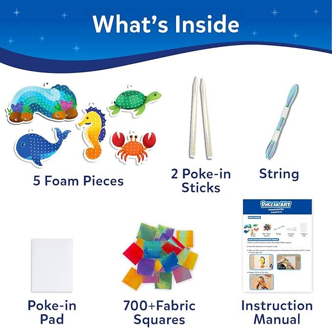 Dive into ocean creativity with this mess-free fabric art kit that creates a stunning DIY mobile featuring underwater creatures! Children decorate 5 foam ocean animals with over 700 colorful fabric squares using the innovative poke-in technique, then string them together to craft a beautiful hanging mobile. No glue, paint, or scissors required - just the satisfying process of poking fabric squares into foam slots transforms flat pieces into dimensional, textured sea creatures. The completed mobile adds a personal, handcrafted touch to bedrooms, playrooms, nurseries, or any space needing ocean-themed decor. This tactile activity develops fine motor skills, hand-eye coordination, pincer grasp, and visual perception as children carefully place fabric squares to create colorful underwater designs. The protective poke-in pad keeps work surfaces clean throughout the crafting process, making this truly mess-free for home or classroom use. High-quality materials ensure durability, allowing the finished mobile to be e