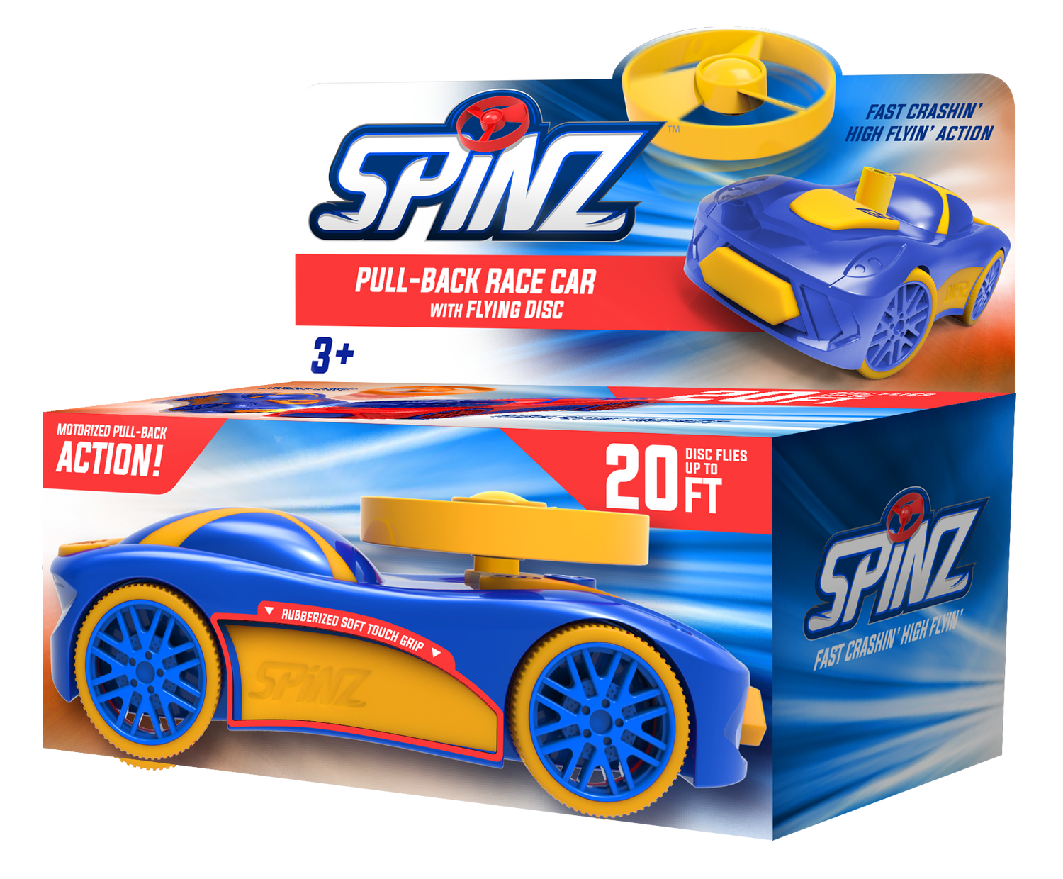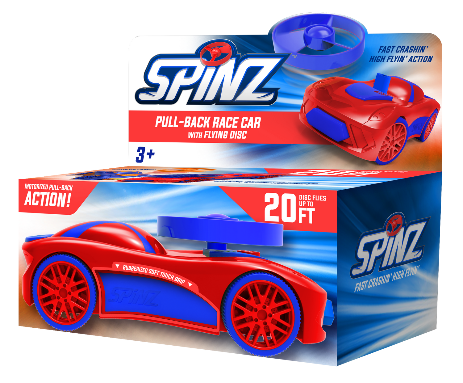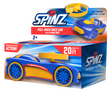 SPINZ combines two classic toys into one 1:43 scale, unique racer. A sleek race car with powerful pullback motor drives the vehicle forward while a crash depresses the front bumper and launches the spring-loaded propeller up to 20 feet in the air. Over-molding is utilized to provide distinctive, colorful, rubber accents that reveal a unique tactile sensation.
