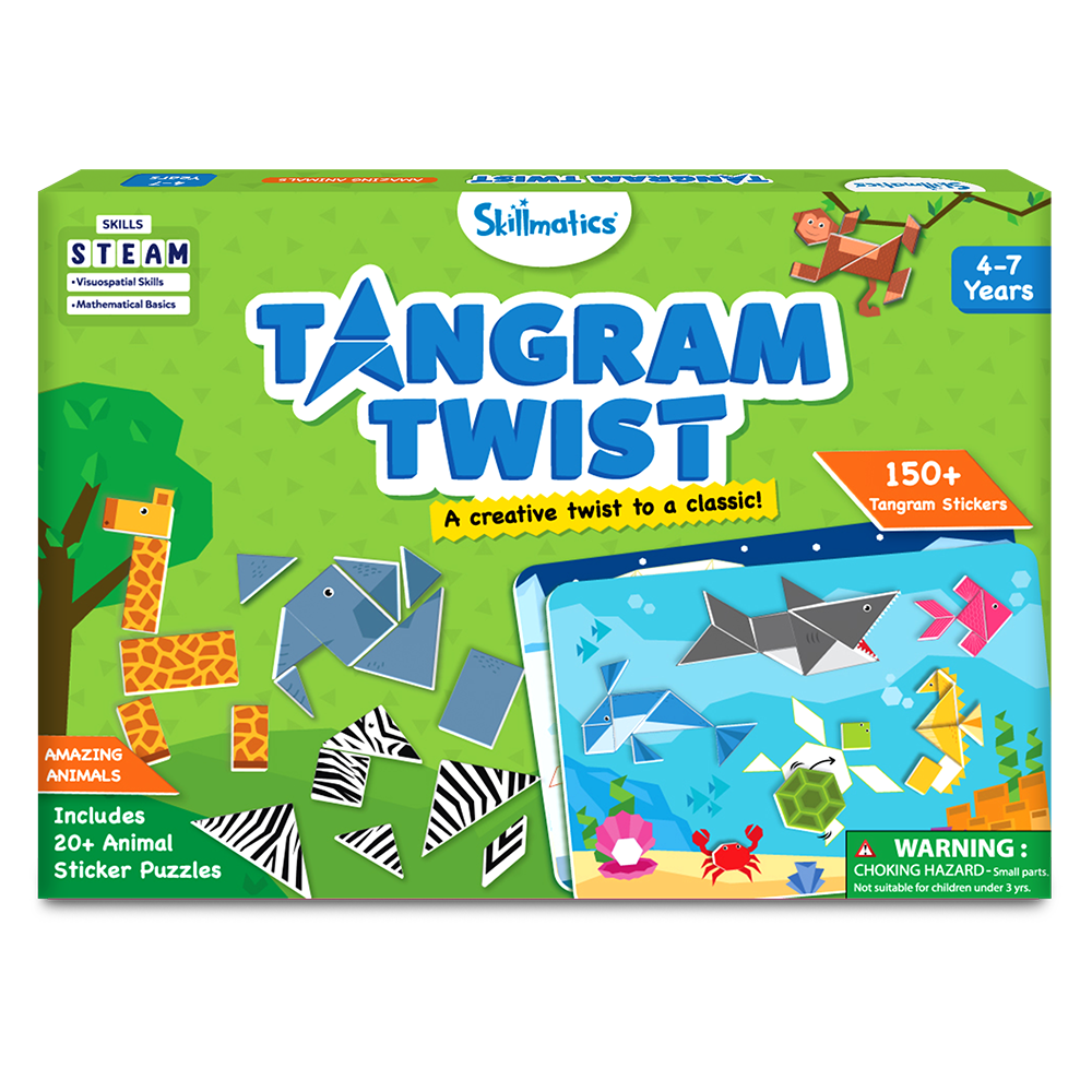 Tangram Twist: Amazing Animals by Skillmatics turns classic tangram puzzles into a colorful and mess-free craft adventure for kids. Using over 150 easy-to-peel foam stickers, children complete 5 reusable boards filled with vibrant animal scenes from the farm, forest, and ocean. Match, rotate, and stick geometric shapes to build animals like cows, whales, giraffes, and more. This hands-on STEAM activity boosts spatial reasoning, fine motor skills, and problem-solving in a fun, engaging way. No glue, no cutting, and no mess. Just creative fun at home, in the classroom, or on the go. Perfect for early learning and quiet time play.