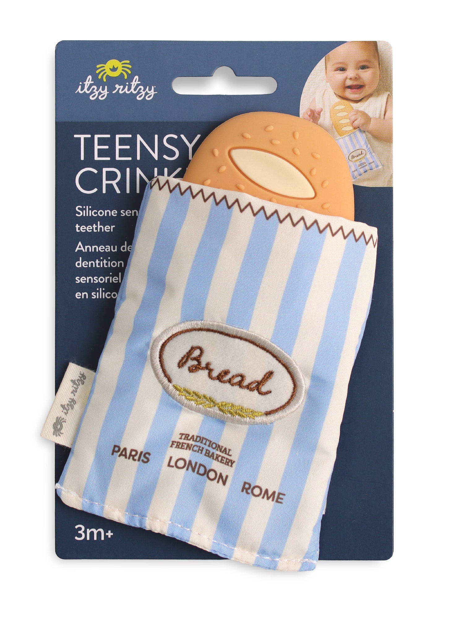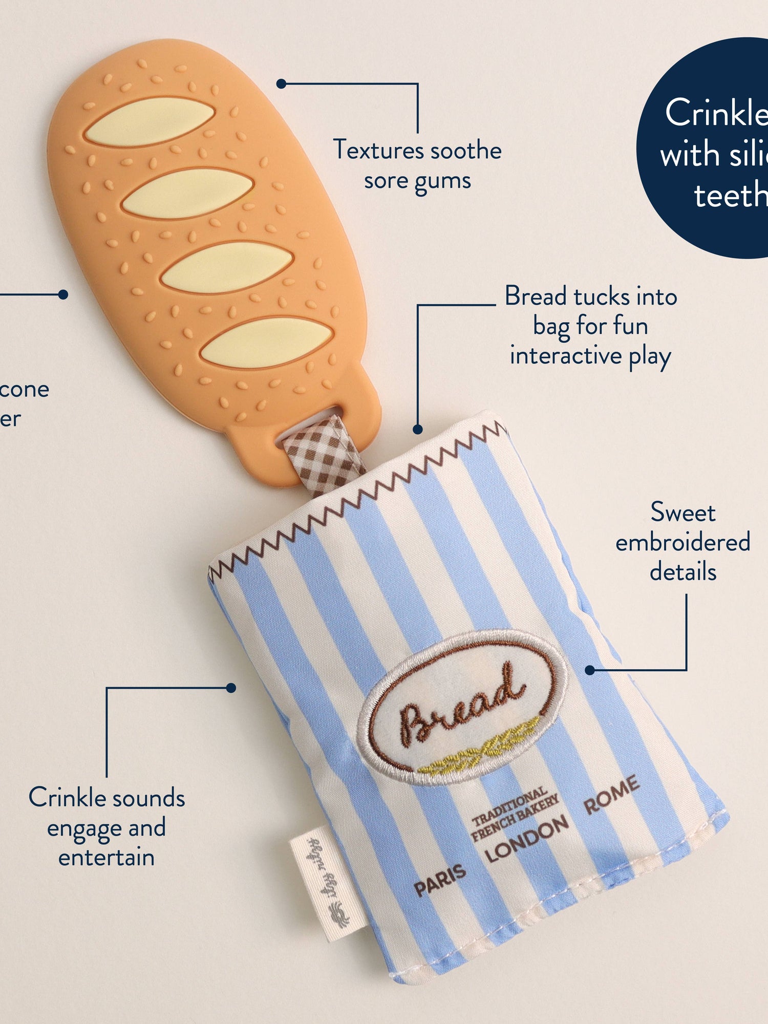 Crinkle & Soothe! Get ready for double the fun with the Teensy Crinkle! This adorable essential combines a soothing silicone teether with soft plush and crinkle sounds. It is sure to delight your little one’s senses!