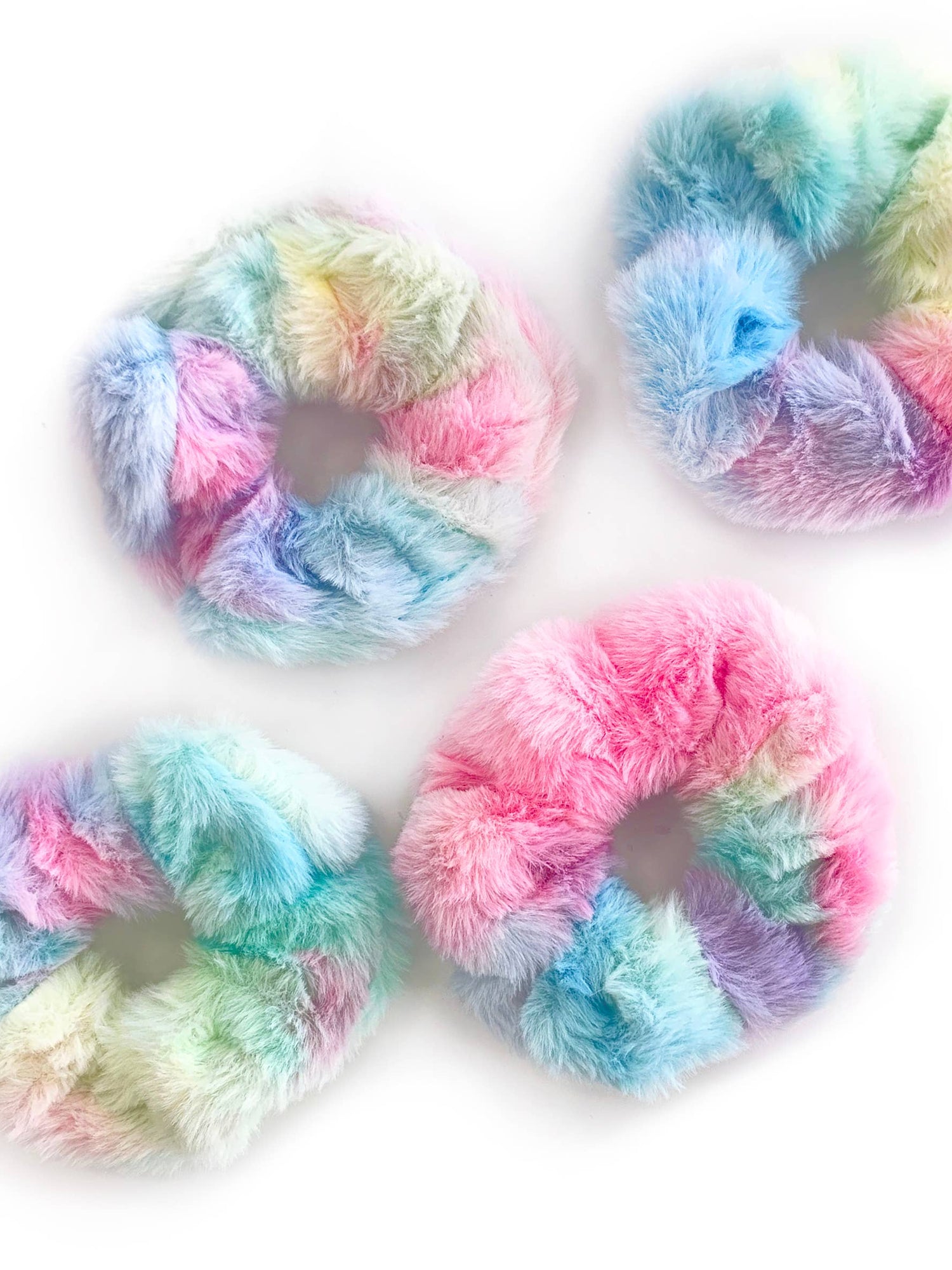 Tie-Dye Furry Scrunchies! The cutest ponytail accessory for all ages 5+ now in tie-dye! Perfect for keeping your hair out of your face! Tie Colors may vary.