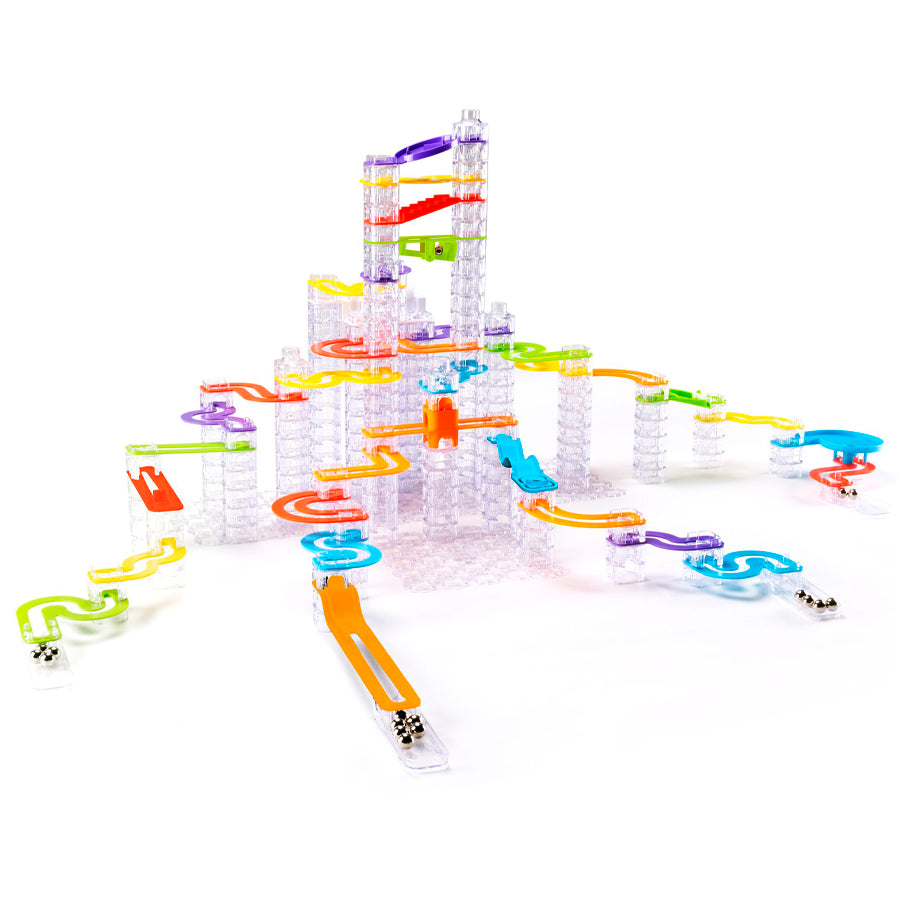 - Includes 26 basic tracks, whirlpool track, stairs track, bouncer track, plinko track, switcher track, 200 risers, 4 catchers, 4 toppers, 20 steel balls, 4 bases, catch-and-release track, combiner track, ski jump track, wait-your-turn track, fill-and-spill track, 5 tall risers, long-run track